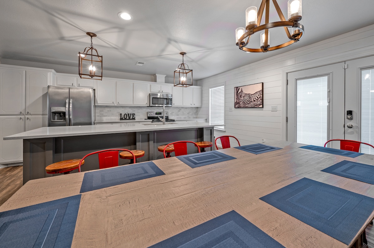 Nieuw alles! Open in 2022. Super schoon! Elke gast rauwt over deze plek! Fantastische keuken met enorm, wit kwarts-eiland; zitplaatsen 4, eetkamerstoelen 8. Open concept keuken & familie rm voor geweldig vermaak. De slaapbank kan worden uitgetrokken om achterover te leunen en 70-inch tv te kijken. Sterke wifi. Eigen kantoor. Comfortabele bedden! Enorme speelkamer met tafelvoetbaltafel, zitzakstoelen. Full size wasmachine/droger. Voorportaal biedt plaats aan 6 personen. Omheinde achterkant met grill, chimenea, vuurplaats. Voldoende parkeergelegenheid. 2 mijl naar Lake Texoma. Lage schoonmaakkosten.