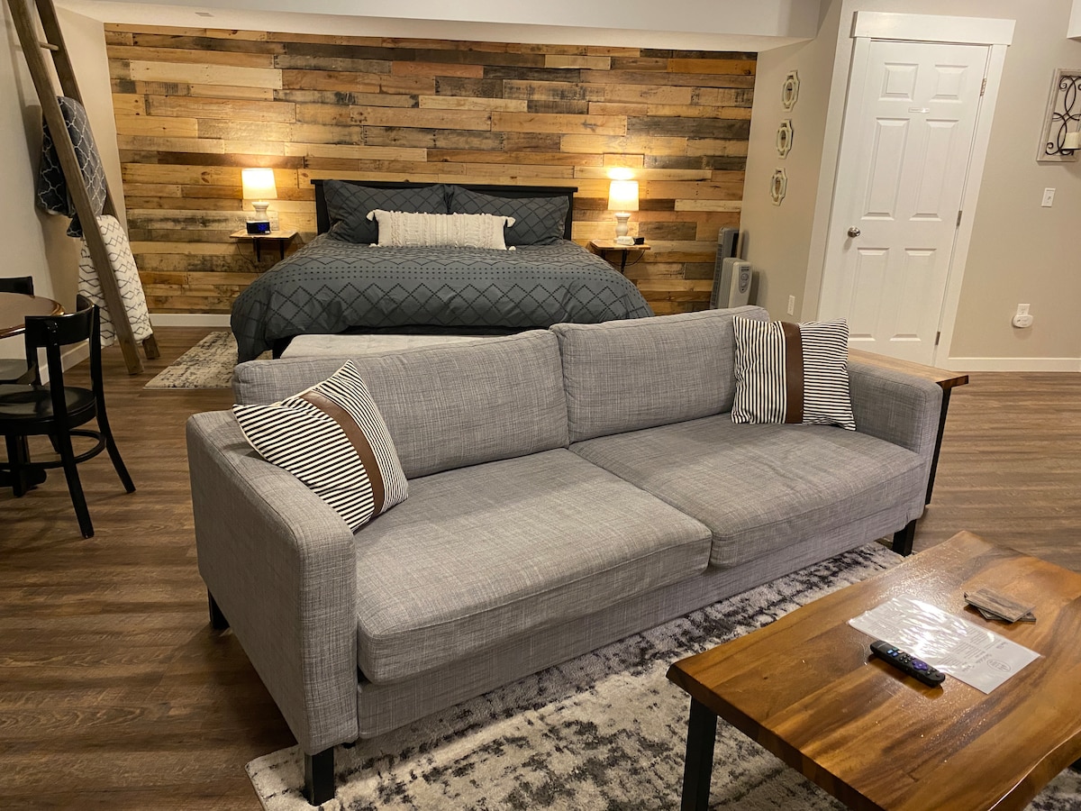 Geniet van een eigen ingang naar deze gezellige daglichtkelderstudio in de buurt van wandelpaden en de Little Spokane River, op slechts 5 minuten van winkels en eetgelegenheden. Binnen vind je luxe vinyl plankenvloeren, een stijlvolle palletwand en verse verf. Rust uit op het BESTE kingsize bed (gasten zijn er enthousiast over!) of de IKEA queen pull-out, perfect voor kinderen of een extra gast. Tot de voorzieningen behoren wifi, een Roku-tv en een dvd-speler met films. Reis je met een camper of oplegger? Uitgebreid parkeren is aanwezig!