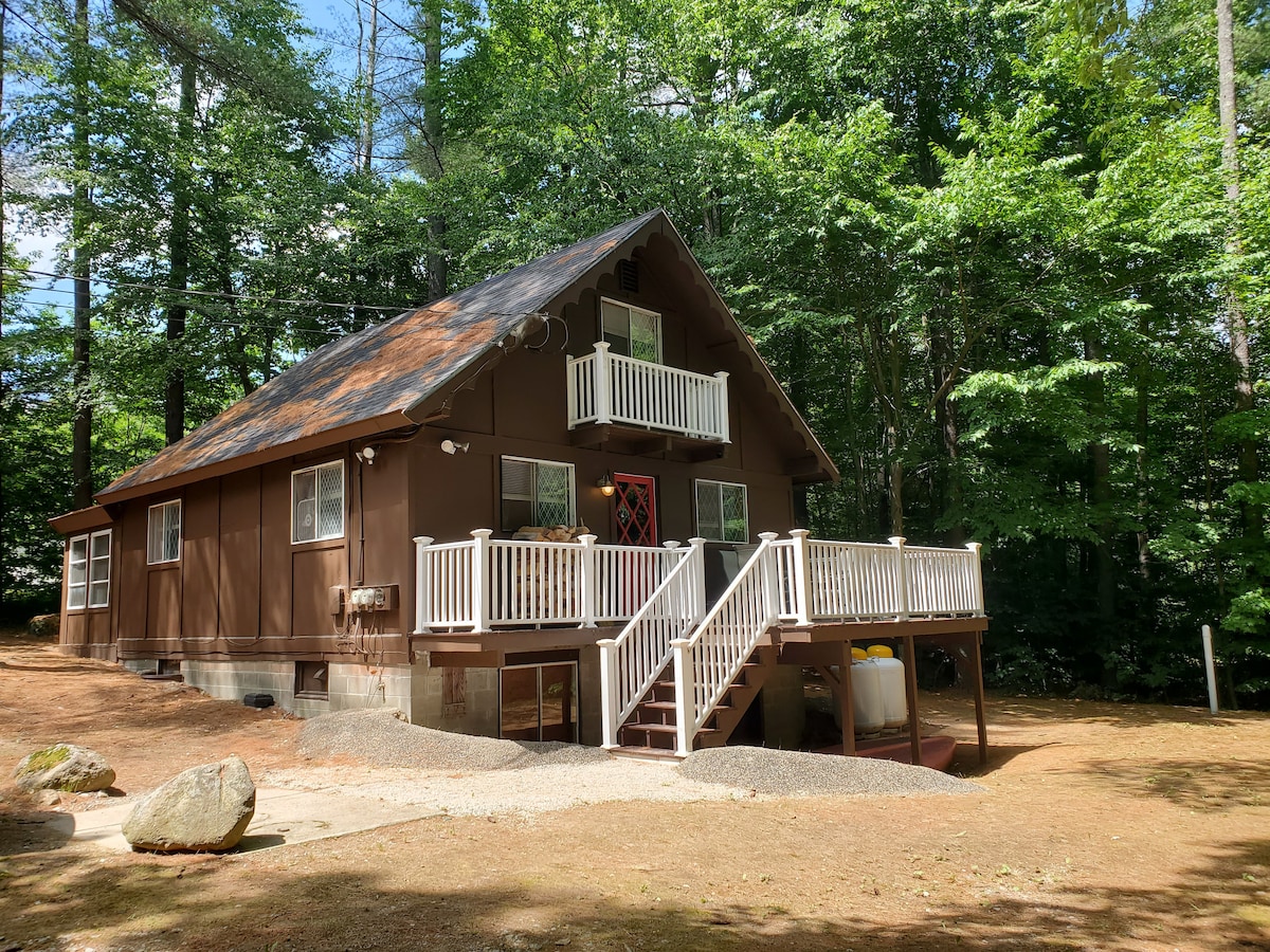 My year-round A-Frame cabin is 30 min to Mount Sunapee, 20 min to Crotched, and 15 min to Pat's Peak! It’s on a small 32-acre pond in New Hampshire. It is truly heaven on earth. There is over 100 feet of direct waterfront. There is a 6 foot main dock, and a small fishing dock off to the side. The fishing on our pond gets rave reviews! Most people catch and release, but please follow NH fishing laws: 16+ needs a license. The property sits on 1/3 of an acre, on a sloped hill.