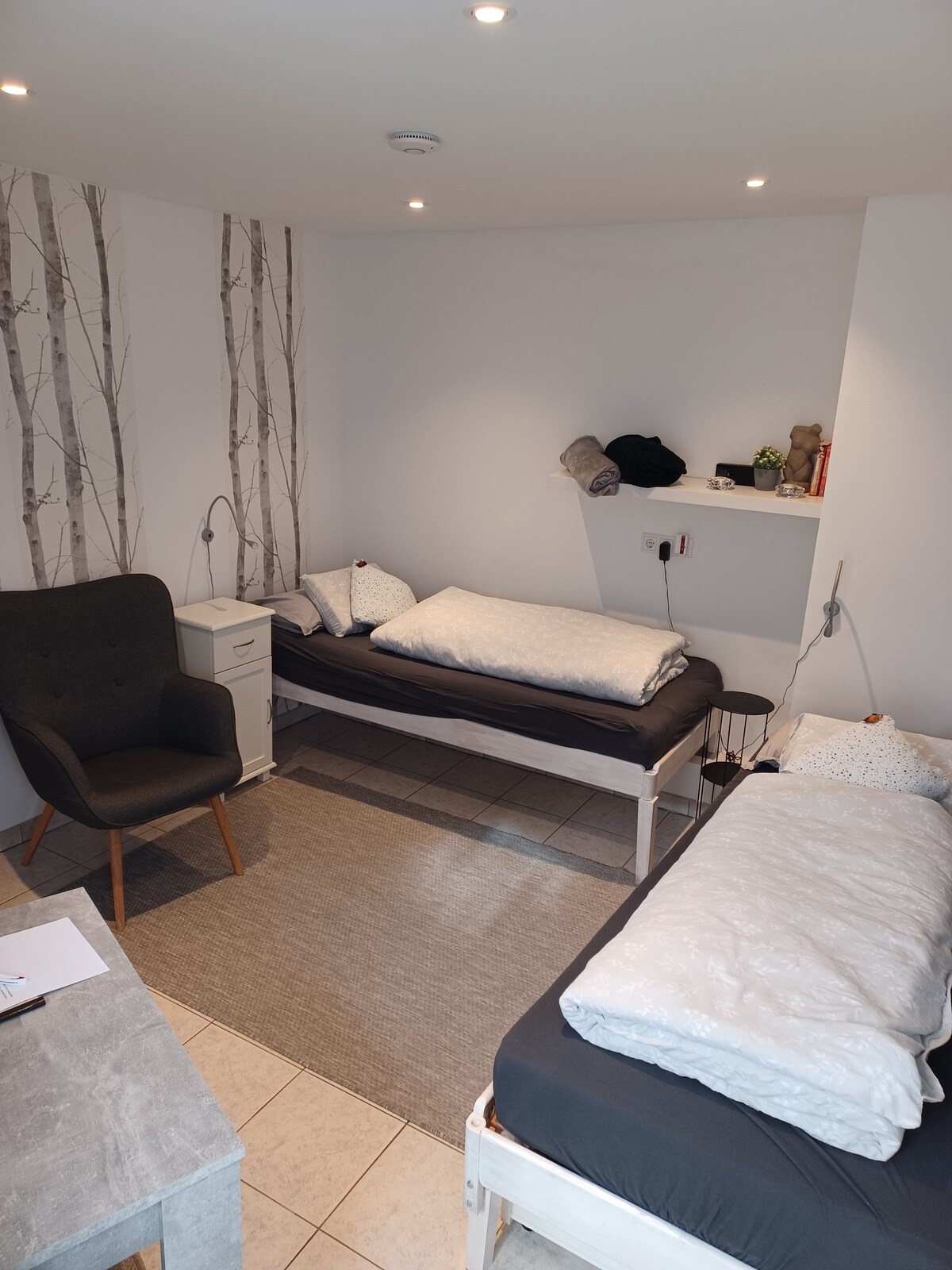 Dit 1-kamerappartement in het centrum van Mettmann biedt een moderne woon-/eetkamer/slaapgedeelte met ingerichte keuken, een gang incl. Kledingkast en een ruime badkamer met gelijkvloerse douche. Via het gemeenschappelijke trappenhuis heeft u via een afsluitbare toegangsdeur toegang tot het appartement op de 1e bovenverdieping. Andere voorzieningen zijn twee eenpersoonsbedden (90x200cm), een eettafel voor 2 personen, een kleine kitchenette, een tv, een fauteuil met kleine tafel, wifi voor gasten en een kledingkast.