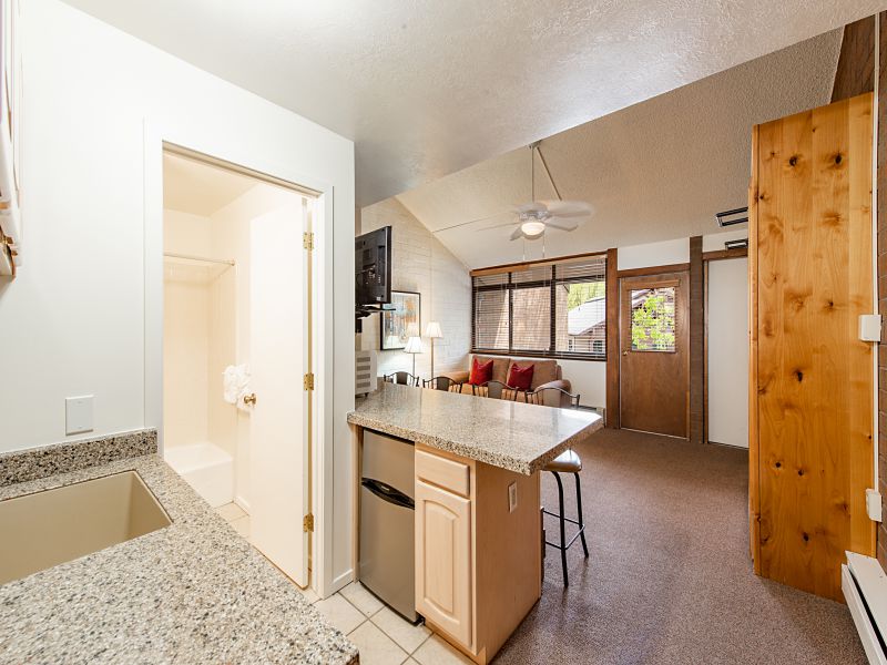 Gerenoveerde Prospector-studio met queensize bed en comfortabele slaapbank met traagschuimmatras. De unit beschikt over een eettafel voor 4, elektrische open haard, 40inch HDTV met DirecTV en dvd, overdekt dek en gratis wifi! De keuken heeft een was-droogcombinatie, een koelkast op barhoogte, een vierpits kookplaat, een grote magnetron, een Kuerig koffiezetapparaat met een selectie van koffie, thee en zelfs warme chocolademelk! Er zijn ook een broodrooster, blender en een Oster aanrechtconvectieoven groot genoeg voor een 12" pizza!