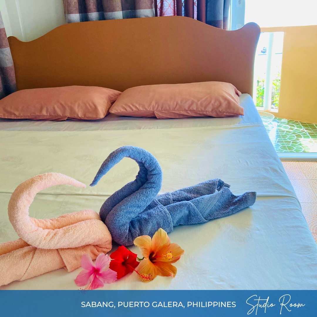 Het appartement is gelegen in Dream Hill Condos & Spa 3 sterren complex. Het heeft een fantastisch uitzicht over Batangas Strait, het strand van Sabang en de zon ondergaat de beste hoek. Het heeft een queensize bed, een flatscreen-tv met kabelzenders, Starlink-wifi, een automatische startgenerator en gratis parkeergelegenheid.