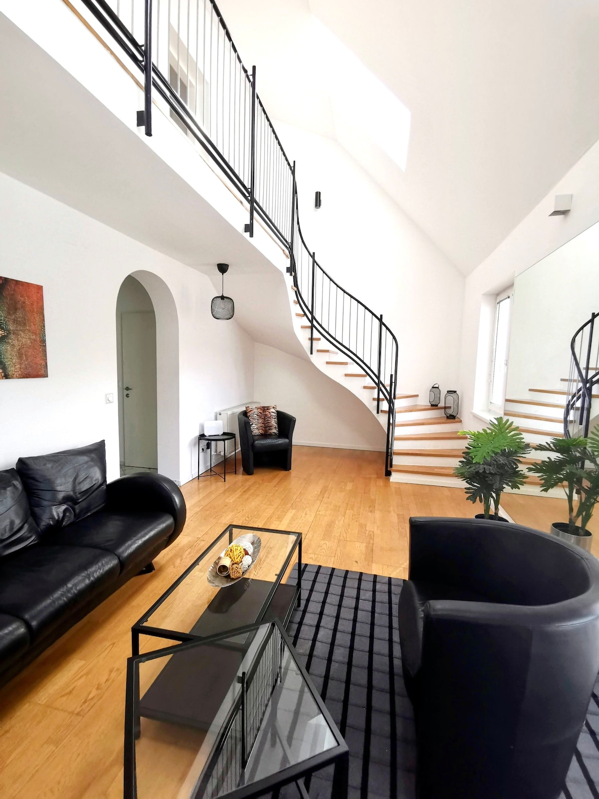 Ihr wohnt in einer lichtdurchfluteten 121m² Dachgeschosswohnung in ruhiger Lage mit Terrasse und Platz für bis zu 7 Personen. Im unteren Geschoss befindet sich der Eingangsbereich, die voll ausgestattete Küche mit Essbereich, ein Badezimmer mit Badewanne, ein separates WC und das Wohnzimmer mit Zugang zur Terrasse. Im oberen Stock gibt es 2 Schlafzimmer, eine Galerie mit Schlafsofa und ein WC. Ein kostenloser Parkplatz steht an der Unterkunft zur Verfügung, die Verkehrsanbindung ist sehr gut.