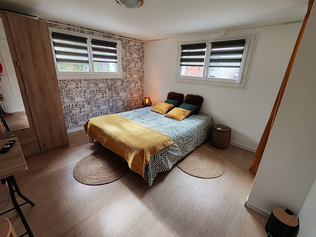 Gemeubileerde studio van 17 m2 in privétuin, dichtbij alle voorzieningen. Inclusief een woonkamer met kitchenette, tv en 1 BZ bank, kleedruimte en aparte badkamer met toilet. Borden, handdoeken, handdoeken, badhanddoeken, douchemat, lakens, dekbed en 2 kussens aanwezig, isolatie met dubbele beglazing, VMC, individuele verwarming, gratis parkeren, wifi, gratis toegang tot het terras en barbecue. Roken niet toegestaan.