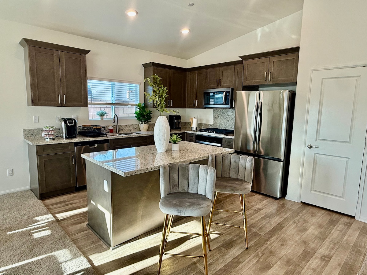 Ontspan met het hele gezin op deze rustige en vredige plek om te verblijven en heb het hele huis alleen. Leuke familiebijeenkomsten en hebben elk je eigen privéruimte wanneer je 's nachts in eigen kamers of voor de open haard loopt. Geniet van de ruime achtertuin waar je 's ochtends een kopje koffie kunt drinken, buiten kunt dineren of Pickleball, biljart of pingpong kunt spelen. Gewatteerde terrasstoelen om tot rust te komen met het gezin. Idyllisch uitzicht op de bergen en op enkele minuten afstand van essentiële plaatsen.