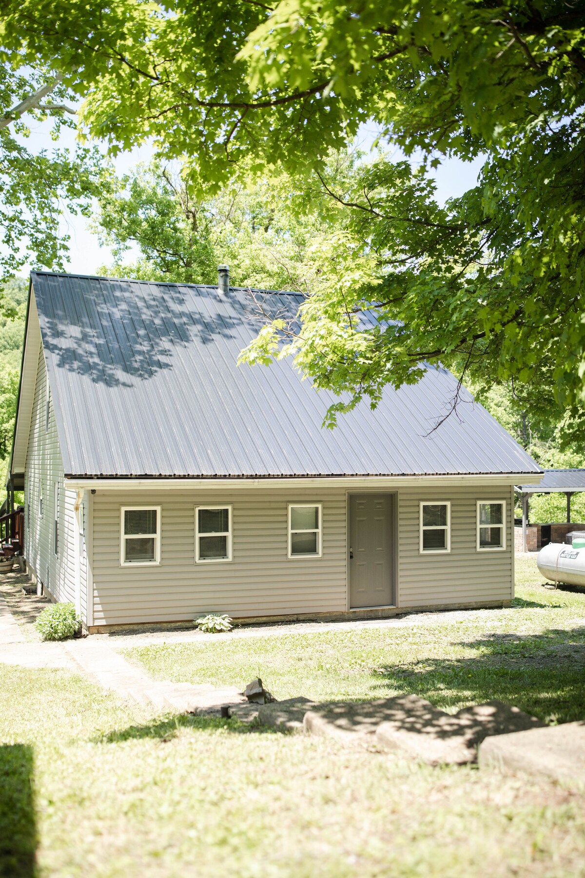 Onze hut is echt een rustige plek op het platteland om 'op adem te komen' en te ontspannen in de schoonheid van Gods schepping. Er zijn paden van meer dan 32 hectare glooiende heuvels en bossen waar je herten en andere wilde dieren kunt besluipen. Comfortabel voor vier. Vuurplaats/grill en brandhout. Veranda met tafel en 2 stoelen om je koffie te drinken. Terras met gasgrill, 4 stoelen, tafel. 2 slaapkamers met queensize bedden, 1 badkamer met douche, wasmachine/droger. Volledige keuken. 55' smart-tv, dvd-speler, wifi Huisdiervriendelijk. $ 50 /verblijf