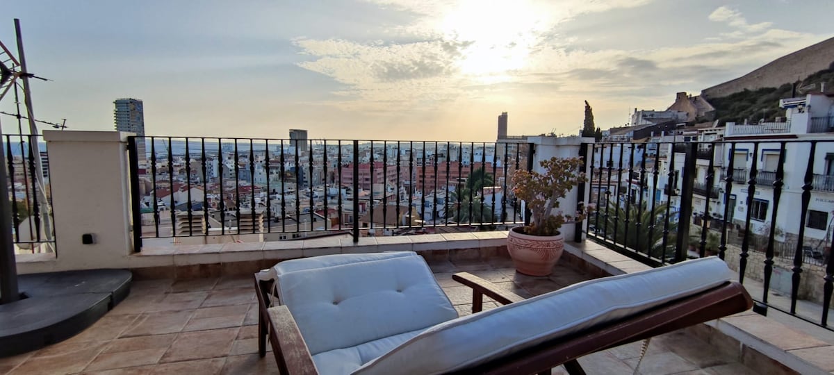 Charmant penthouse op 30 meter van het strand van Postiguet in Alicante. Ideaal voor 2 gasten. Unieke inrichting, eigen badkamer, buitenterras (mini glazen keuken) met uitzicht op de Middellandse Zee, Postiguet Beach. Bed 2 meter hoog (zolder) en slaapbank die kan worden voorbereid met voorafgaande kennisgeving. Gelegen in een rustige vissersbuurt (Raval-Roig) en op 5 minuten van het centrum. Een origineel huis uit de jaren 1920, het behoudt zijn charme, maar met alle voorzieningen, het is een appartement op de derde verdieping zonder lift.