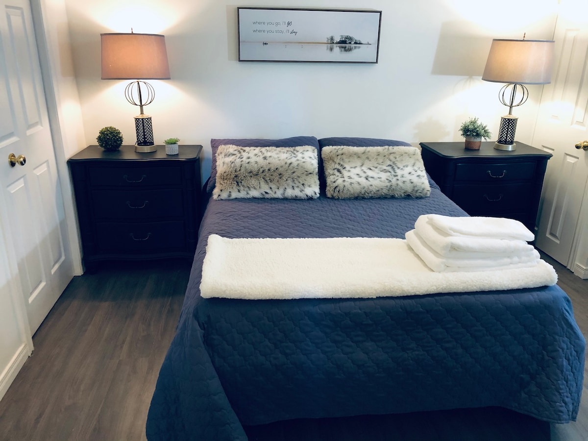 We hebben onlangs onze kelder gerenoveerd om een stijlvolle, moderne, gezellige en rustige gastsuite te creëren. Er is een zij-ingang die direct op de trap uitkomt en je naar de unit brengt. Er is een metalen buitendeur op slot voor geluidsisolatie en beveiliging. De accommodatie is een licht studio-appartement met drie grote ramen, een complete keuken, een zithoek met tv en open haard, een eettafel, een queensize bed, een inloopkast en een eigen badkamer met een douche van vijf voet. Met uitgebreide geluidsisolatie!