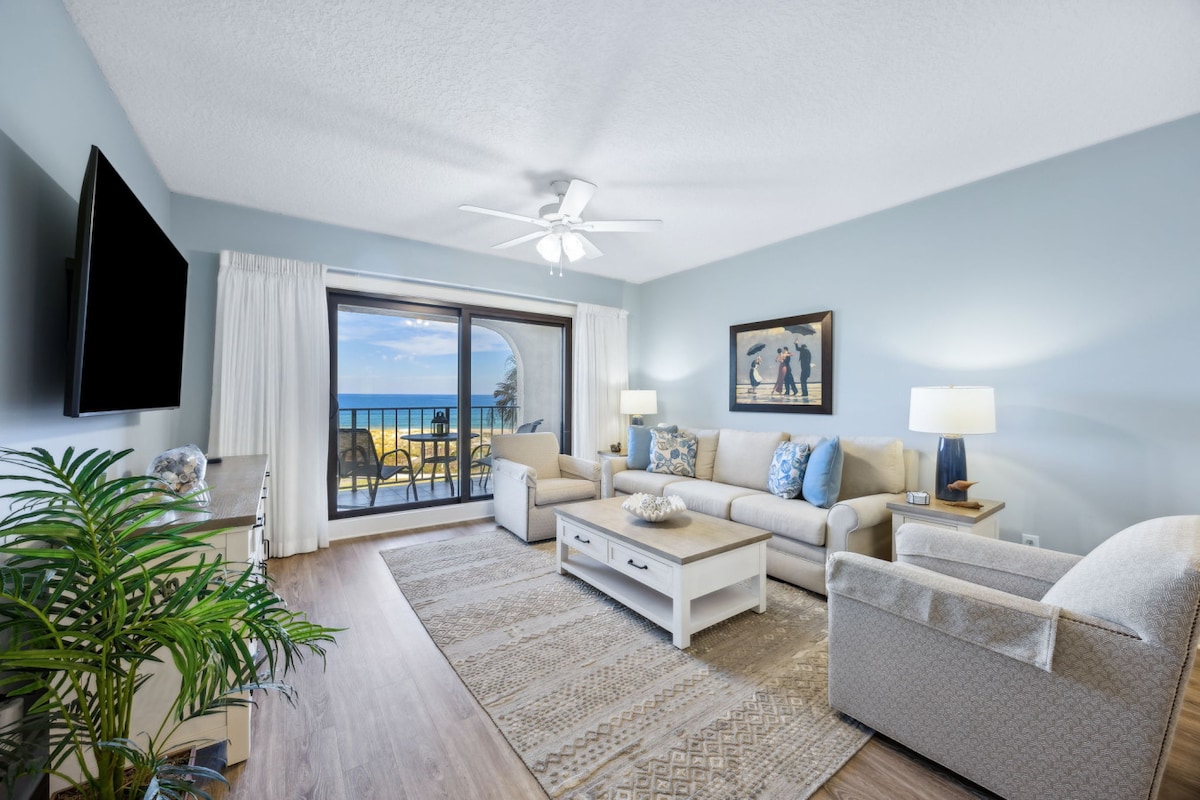 This 2-bed, 2-bath luxury condo sits on Amelia Island's shores, floor 5 of Sea Dunes at Omni Resort. It offers ocean views for a memorable stay. Enjoy mornings on the balcony, listening to waves. Expansive windows in the living, dining, and main bedroom bring the seascape inside. A fully equipped kitchen is ready for meals. The main bedroom has a chaise for reading by the ocean's sound. Smart TVs, high-speed Wi-Fi, and cable in the living room and bedrooms meet your entertainment needs.