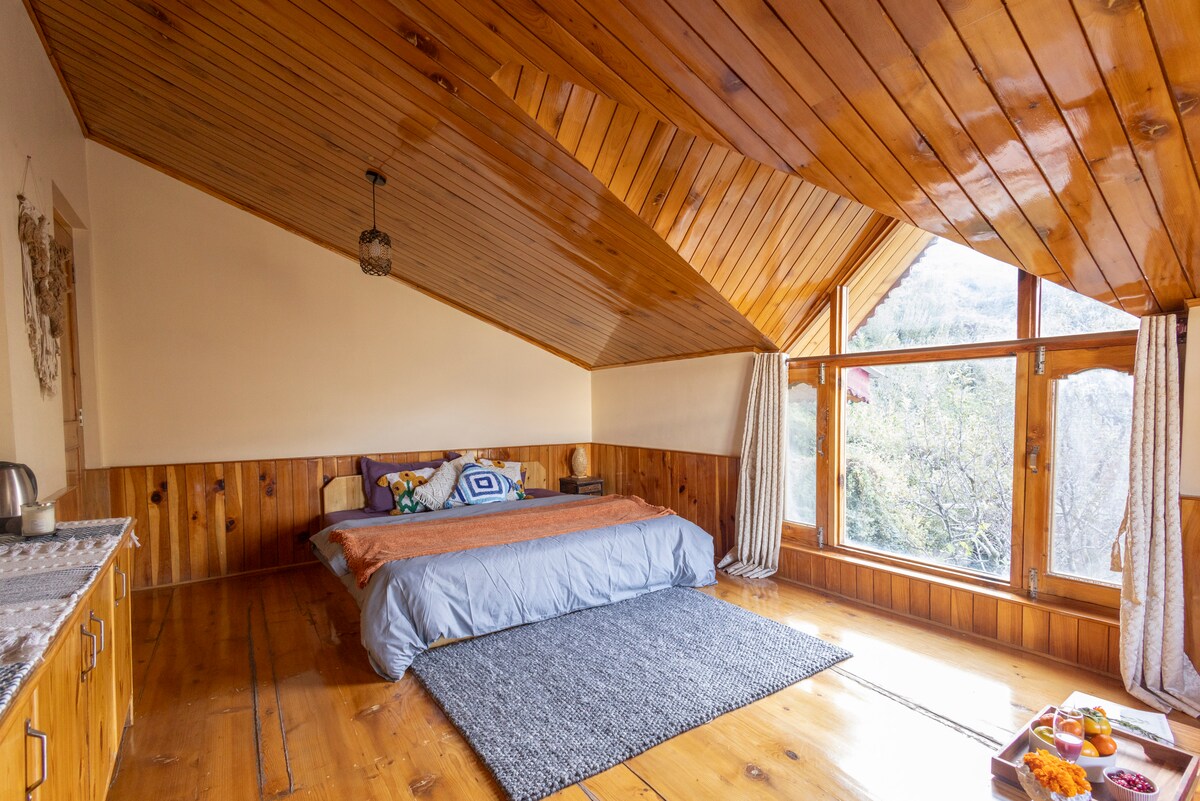 Neem een luie en trage vakantie in ons unieke en afgelegen huisje. Ons huisje is Kathkuni gebouwd, gemaakt met behulp van upcycled hout en 18 inch natuurstenen die de kamer te allen tijde geïsoleerd houden, het heeft ook rustieke modderinterieurs die bijdragen aan de isolatie. Er is een mooi en zeer ruim balkon en we zijn er zeker van dat je het grootste deel van je tijd daar zult doorbrengen. We hebben ook een ervaringskeuken in ons pand waar we multi-keuken eten vers op bestelling maken.
