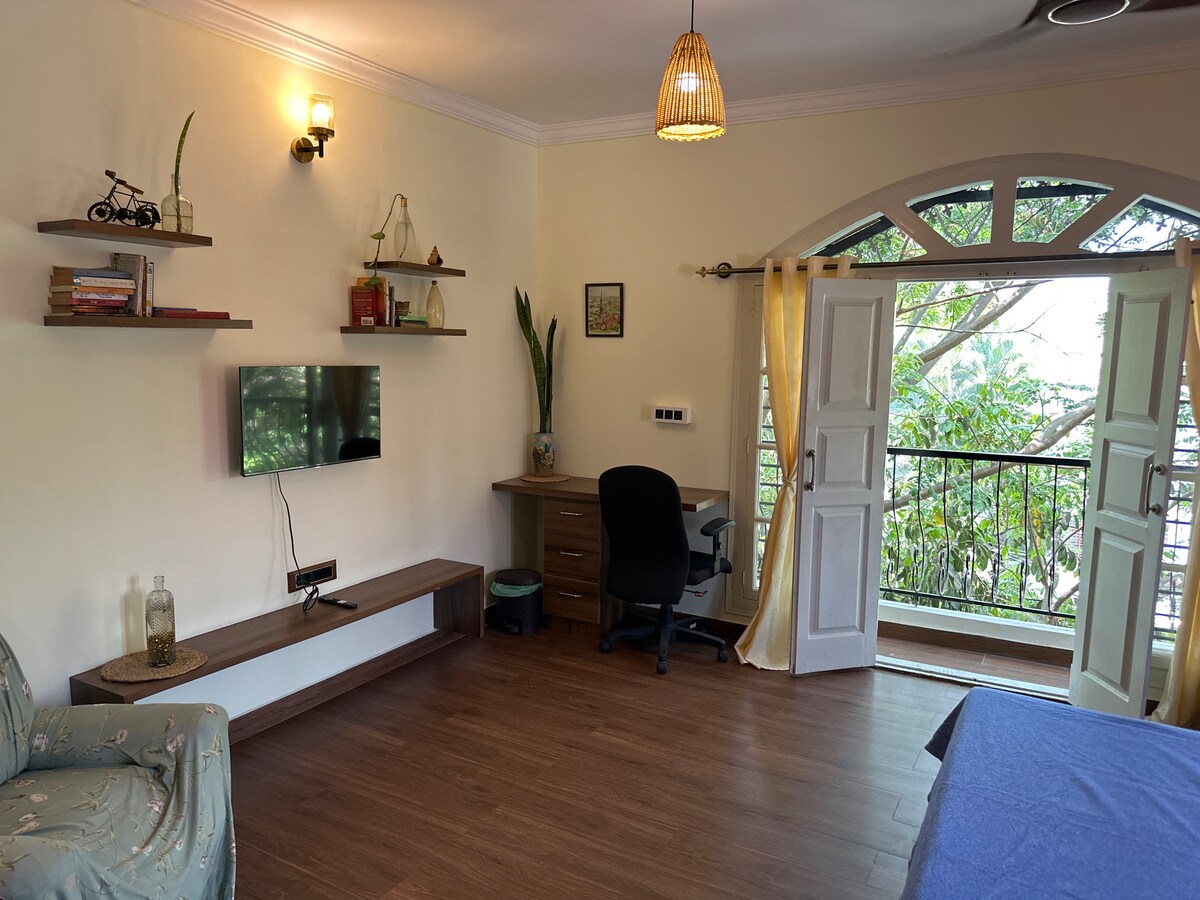 Stand alone studio on villa's terrace with an independent entry. Villa is part of a gated community and the host lives in the floors below, ensuring timely response for anything you need. Entire terrace floor is for guest's exclusive use. This includes a studio, sit-out deck and green terrace full of seasonal vegetables and flowers. 2/4 wheeler parking is available. Ideal for two adults or a couple with a young child. Extra guests can be accommodated on a floor mattress (chargeable)