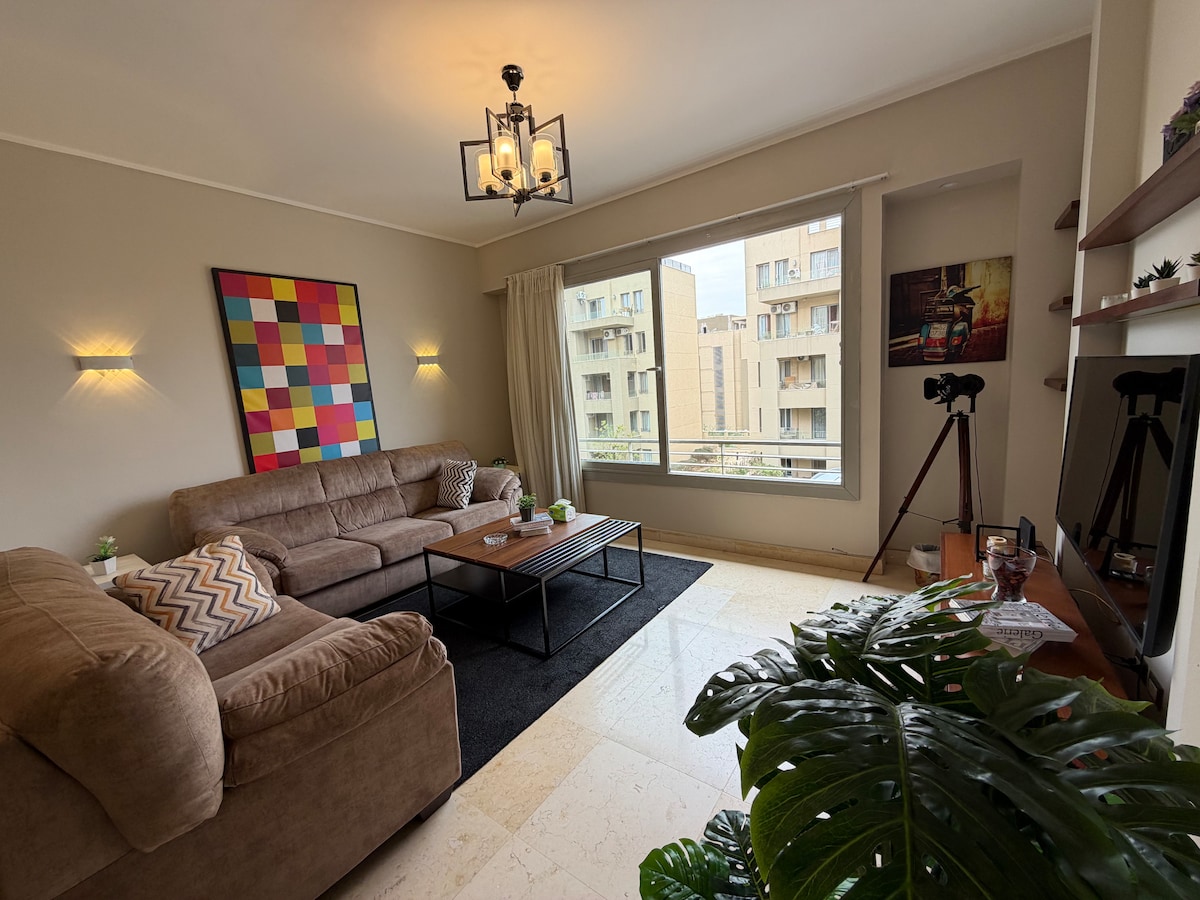 Een huiselijke sfeer, met hotelstandaarden Ervaar een stijlvol appartement met 1 slaapkamer in een toplocatie in New Cairo. Slechts vijf minuten van AUC, EDNC en Waterway, en 10 minuten van de New Capital. De woonkamer is ingericht met een slaapbank, een tv en wifi om je tijdens je verblijf verbonden te houden. De slaapkamer biedt een serene ontsnapping, met beddengoed van hotelkwaliteit voor rustgevende nachten. 1 badkamer, een eethoek, een volledig uitgeruste kitchenette en airconditioning in het hele huis.