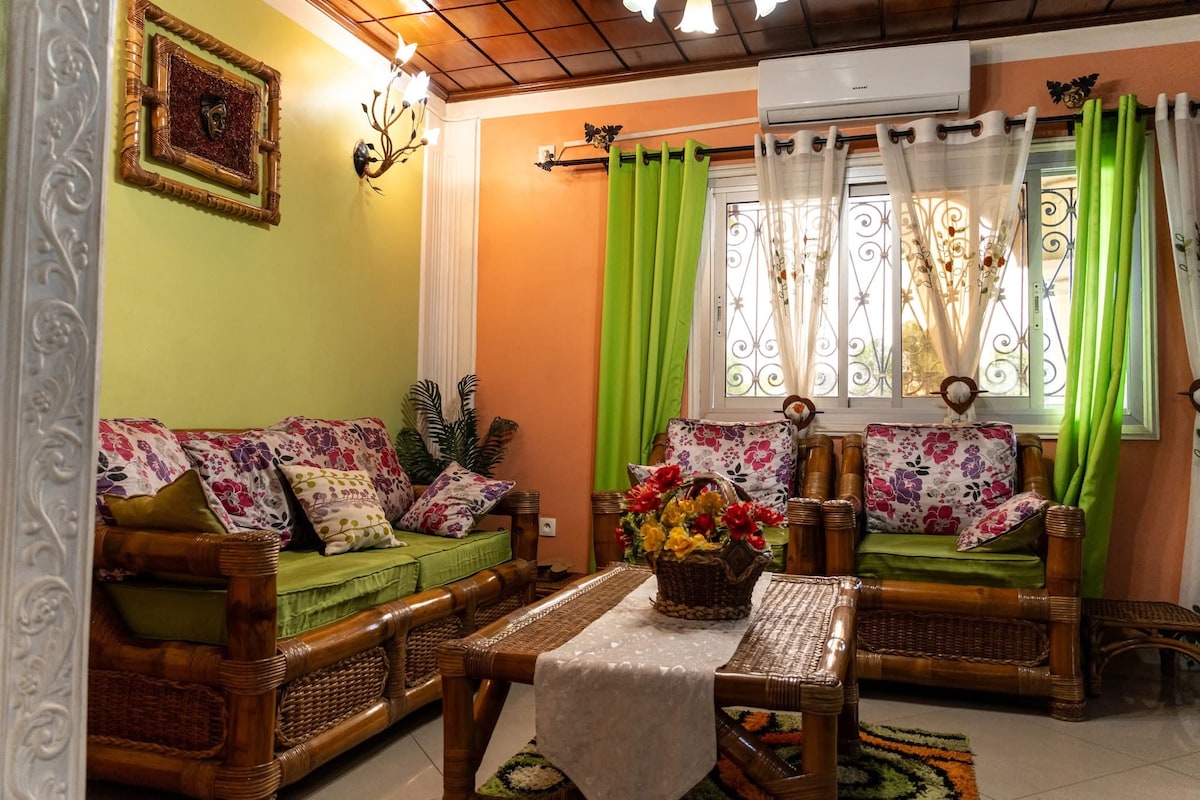 Relax in our peaceful, stylish oasis – just 100 m from the main road and 10 km from the airport. Perfect for vacation, business trips, or simply unwinding. 🏡 The accommodation offers: ✔ Quiet, secure location ✔ Comfortable, stylish furnishings ✔ Tropical surroundings ✔ Ideal for couples, solo travelers & business guests 📍 Nearby amenities: 🛒 Carrefour, Bao, Domino, Spar, China Mall, Bazar 🏦 Afriland, SGB, SCB … 🧸 Fun Center 🍽️ Bars, street food, restaurants