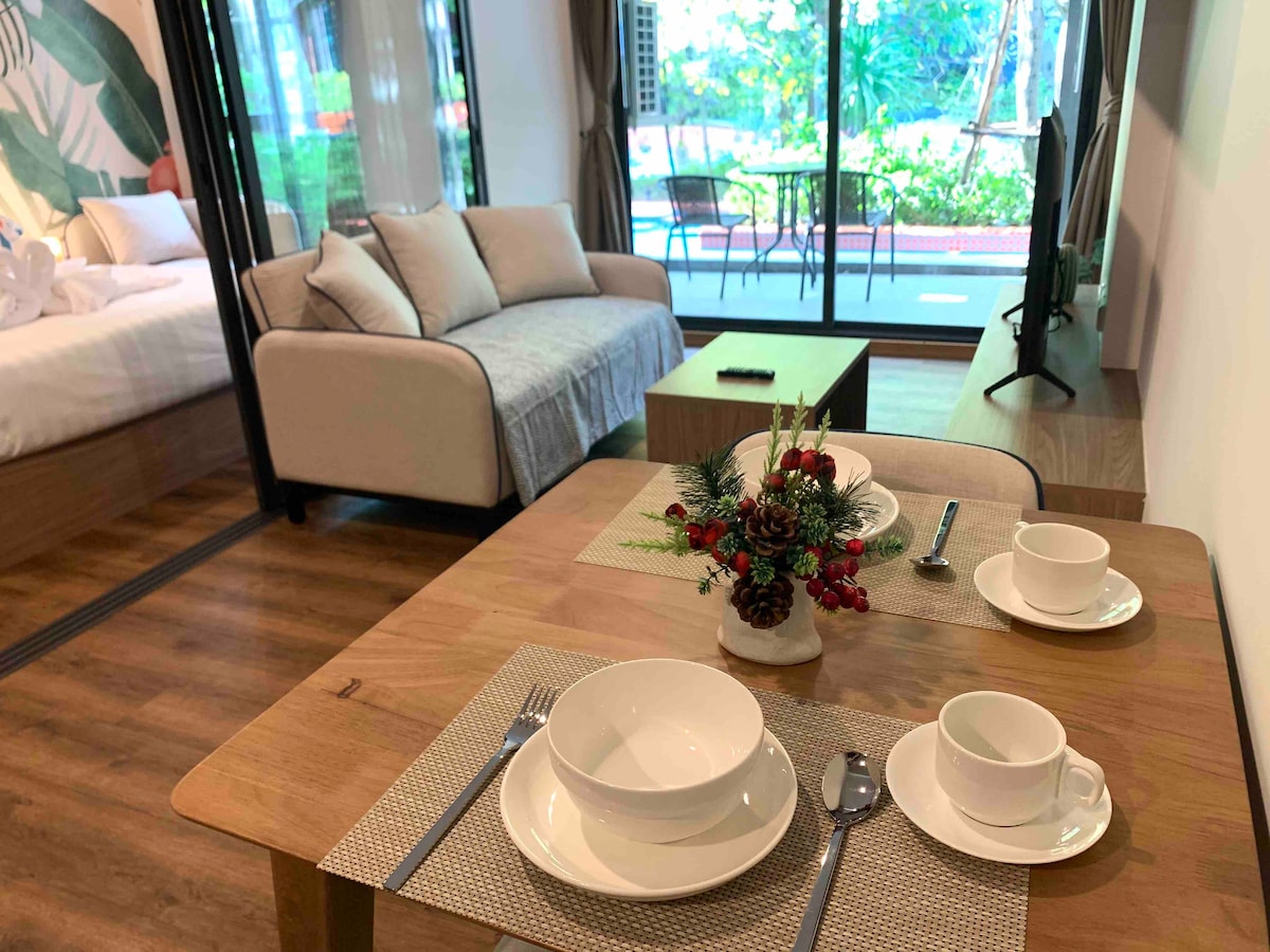 Welkom in een stijlvol nieuw gebouwd appartement met één slaapkamer. Volledig ingericht met moderne luxe met uitzicht op het zwembad. De gezellige slaapkamer is voorbereid met een volledig comfortabel kingsize bedmatras. De ruimte biedt gloednieuwe keukenapparatuur. Er zijn twee smart-tv's voor woonkamer en slaapkamer. De kamer is 50 m². korte wandeling naar het strand, Cicada-markt en tamarindemarkt. Veel restaurants in de buurt. Wifi max snelheid met 300/300 mbps. Nespresso-koffiezetapparaat aanwezig. Deze kamer is perfect voor je vrije tijd of zaken.