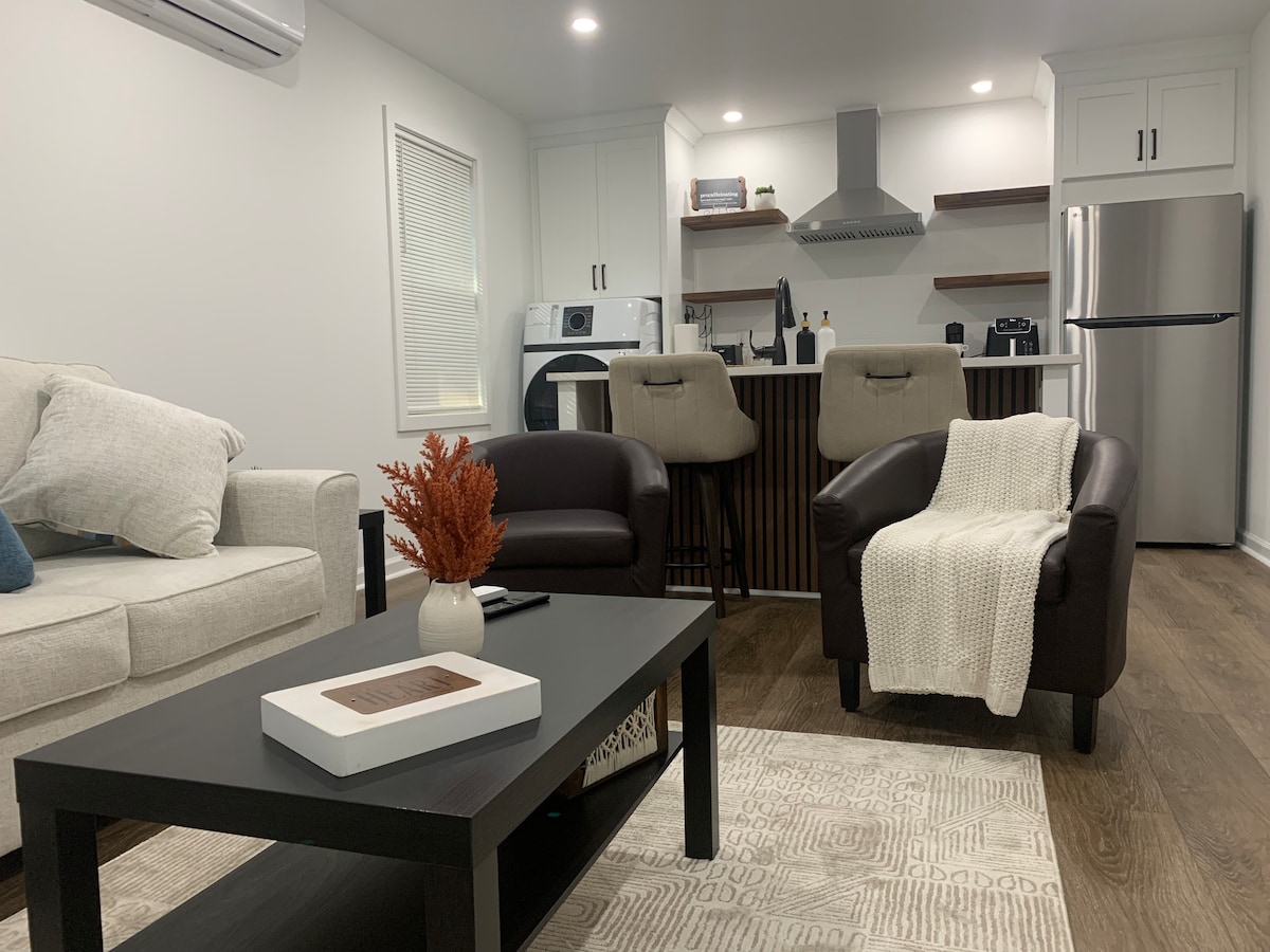 This wonderful cozy studio is super private, with its own entrance right on the side of the house. Plus, it comes with a full kitchen and bathroom. It’s a peaceful, private space with a well-equipped kitchen featuring a big refrigerator, a queen-size bed, a 45” smart TV, a private entrance, an outdoor deck that leads to the backyard, and parking right next to the unit. We’re just a 30-minute drive to downtown Atlanta, Mercedes-Benz Stadium, the GA Aquarium, and 15 minutes to Gas South Arena.