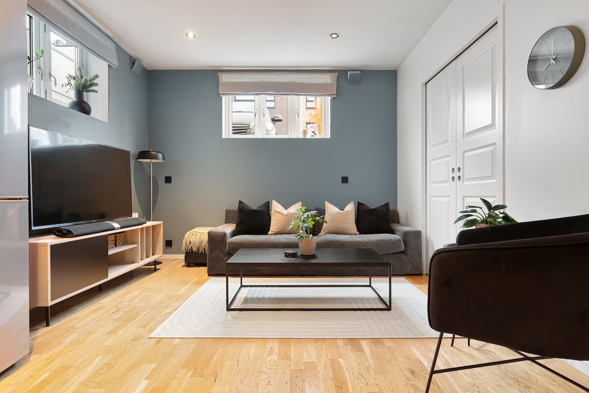 The apartment is on the second floor (about 60sqm) with its own entrance. Located 5 min from the airport, 10 min from city centre by taxi/car. It is a brand new apartment. Light colours and fresh scandinavian design. Seaside view from the living room window overlooking the fjord.