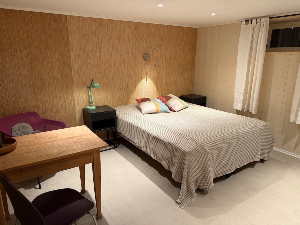Studio/slaapkamer met eigen ingang en badkamer in Hamar te huur. 12 m² slaapkamer/woonkamer plus badkamer van 3 m². Minikoelkast en handige tafel voor maaltijden of als werkplek. De plek is geschikt voor langere verblijven als je liever uit eten gaat/het bij de deur laat bezorgen (raad de app Delivia aan!) dan het zelf te bereiden. Bij langere verblijf wordt de ruimte elke 14 dagen schoongemaakt, inclusief het verschonen van linnengoed/handdoeken.