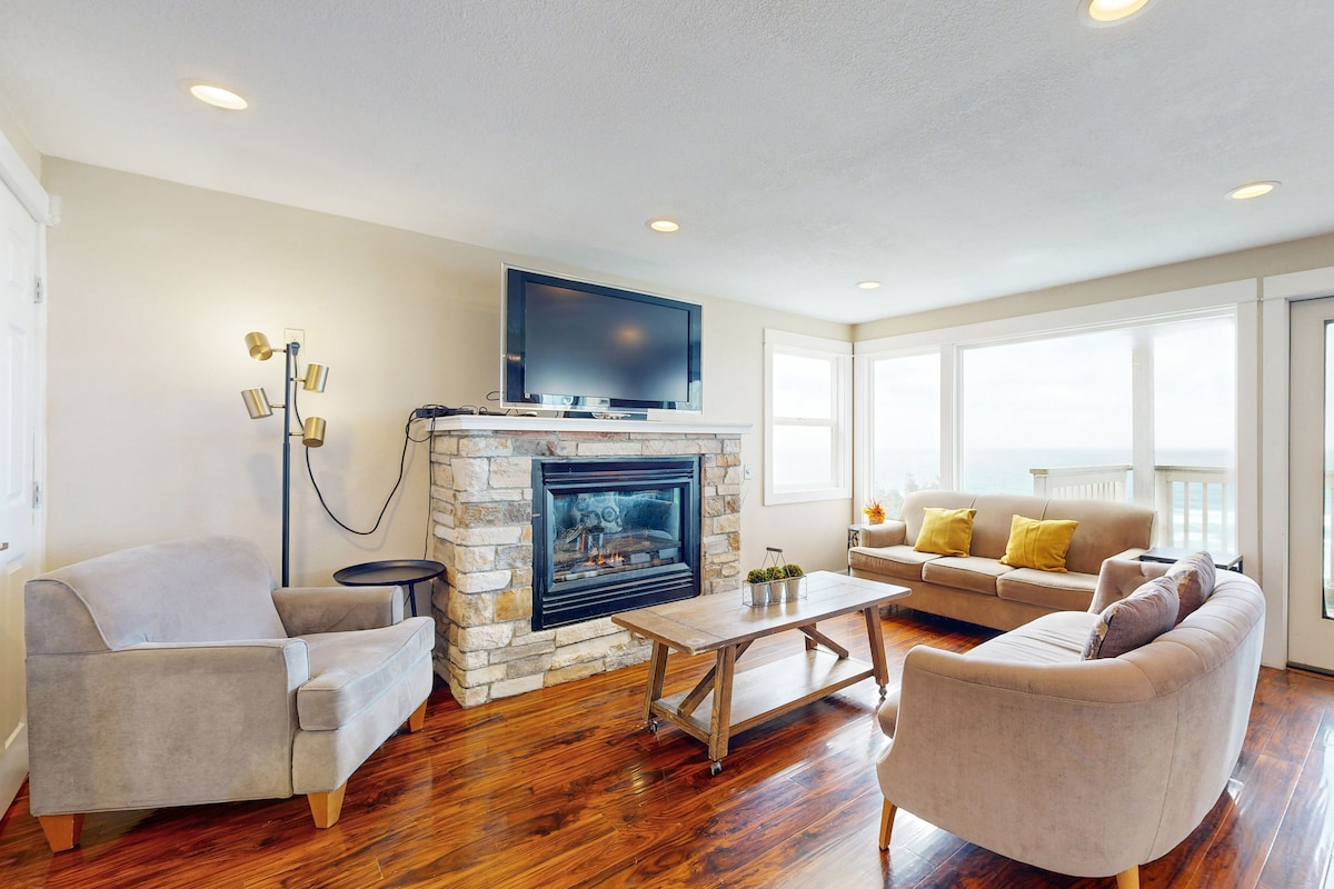 Spacious tranquil 2BR/2BA retreat overlooking Siletz Bay merging into the Ocean, offering nature views. Experience a serene ambiance as birds glide over water. Unwind near the real fireplace with a cup of coffee. Conveniently walk to nearby restaurants, shops, food carts. Enjoy a beachfront view from the window. Sleeping arrangements include 2 Queen beds and a Twin folding bed. Master br with a 2nd bath adjacent to the 2nd bedroom. Includes 1 reserved parking spot, with extra spaces available.