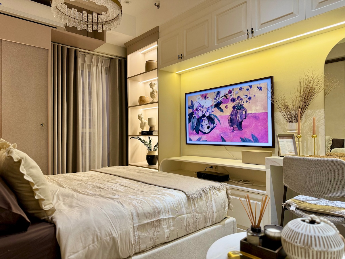 Deze nieuwe unit van 28 m ² combineert een luxe, eigentijdse inrichting met een vleugje warmte en een elegante ervaring waar iedereen van kan genieten. Genesteld op een steenworp afstand van winkels, cafés, restaurants en meer! Het bevindt zich midden in Ortigas en BGC. Rustige ochtenden & leuke middagen wachten op je bij deze unieke ervaring! Overdadig queensize bed, ontspannende bank, goed uitgeruste keuken, elegante badkamer, 55-inch frame-tv, een eigen balkon en een uitnodigende verlichting om je echt thuis te voelen.