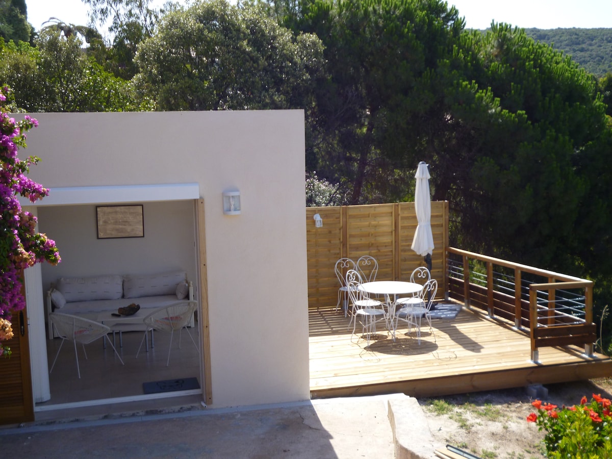 Ideaal voor romantische vakanties en vakanties aan het water. Hartelijke ontvangst, op deze magische plek... Nieuwe studio met airconditioning, met volledig uitgeruste keuken en terras met uitzicht op zee Eigen parkeerplaats op 25 minuten van de luchthaven. Strandactiviteiten, ijsbarrestaurant op het terrein, alle winkels op 500 m afstand . Loop naar de Sanguinaires-eilanden op slechts 1 uur afstand. De Calanques de Piana zijn max. 1u30. Dagelijks vertrek van de boot vanuit de haven van Porticcio naar het beroemde Scandola Reserve