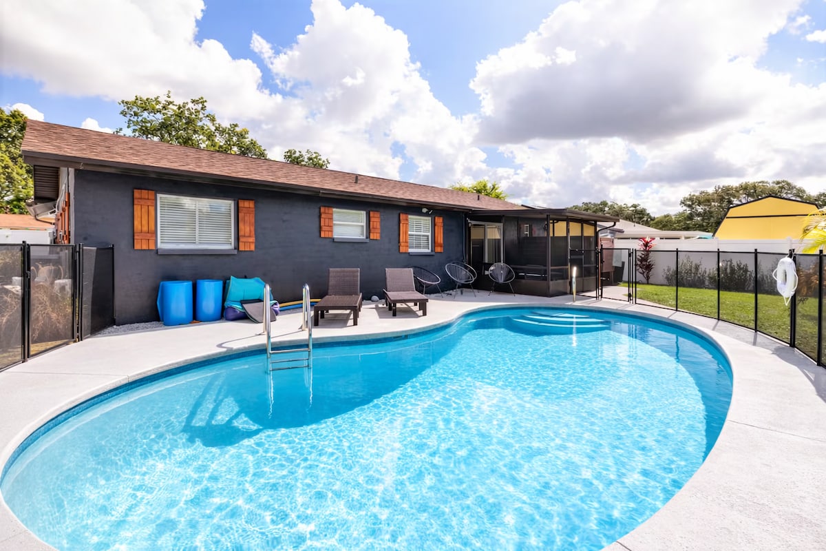 Discover this glamorous 3-bedroom, 2-bathroom home that sleeps 12 guests. Beautiful saltwater pool, resort-like cabana complete with a TV and beverage fridge, tiki counter/bar seating and outdoor dining area. The guest bungalow with its vanity glam station is a real highlight, too! Just 6 minutes from stunning beaches and 4 minutes to Seminole Town Center, this location is unbeatable. Each room boasts a smart TV and is immaculately decorated and professionally cleaned.