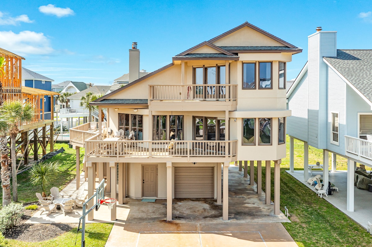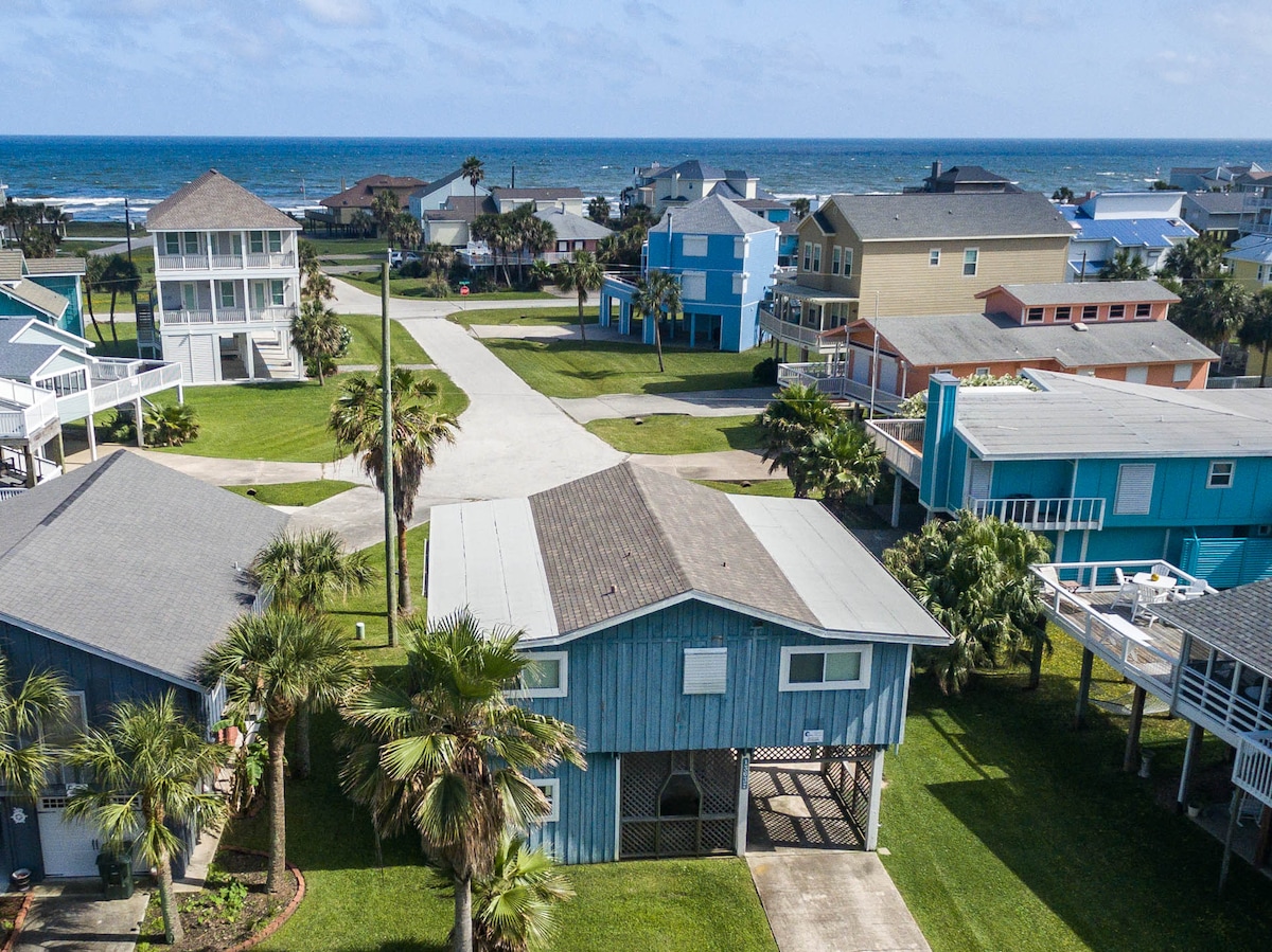 Hasta La Vista! Ontspan en ontspan in dit rustige, stijlvolle huis aan het strand. Ga op het terras zitten met je koffie en luister naar de liedjes van de kustvogels en rustgevende stilte van de oceaan. Grill een aantal goede tijden op de begane grond. Geniet van een heerlijke cocktail op het terras tijdens het spelen van cornhole. Maak lieve s'mores bij de vuurplaats. Maak een snelle wandeling van 3-5 minuten van 1 blok naar het strand zonder het verkeer te hoeven ontwijken of een grote straat over te steken. Geniet van de geschiedenis en charme van Galveston Island!
