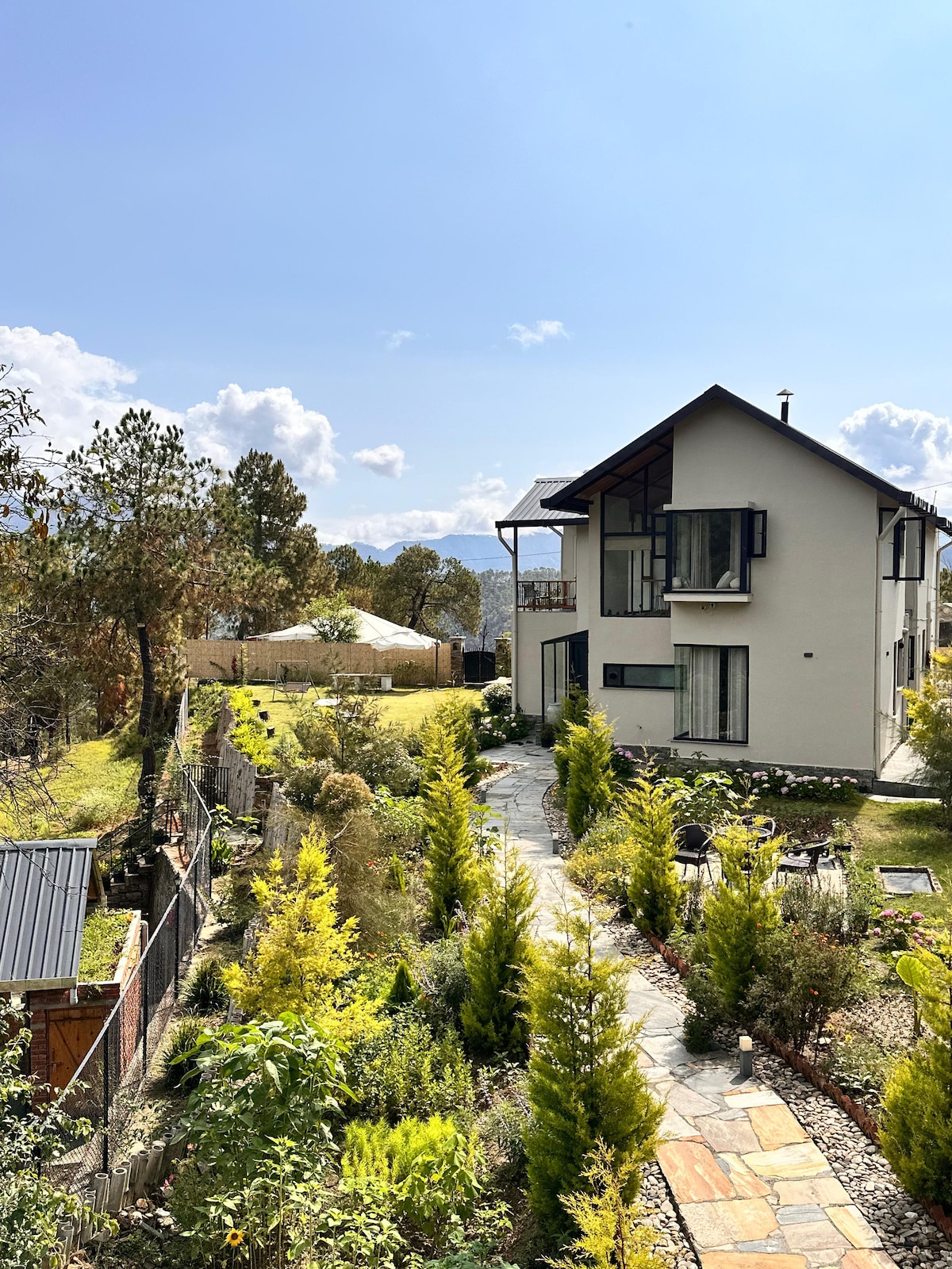 Welcome to Jaadooghar x Chitai Life, Almora. Experience living in the mountains in this lush, pet friendly, mountain home that provides laidback respite with stunning amenities & experiences. We have 3 bedrooms with ensuite washrooms & modern amenities. Enjoy: ➤Fresh Kumaoni meals by trained chefs ➤Living Room, TV, Study, Terrace, Glasshouse, Big Lawn (with outdoor dining, bonfire setup) ➤Board/card games, ➤Parking ➤Picnic setup, outdoor dining, baking class, wood fired pizza, nature treks