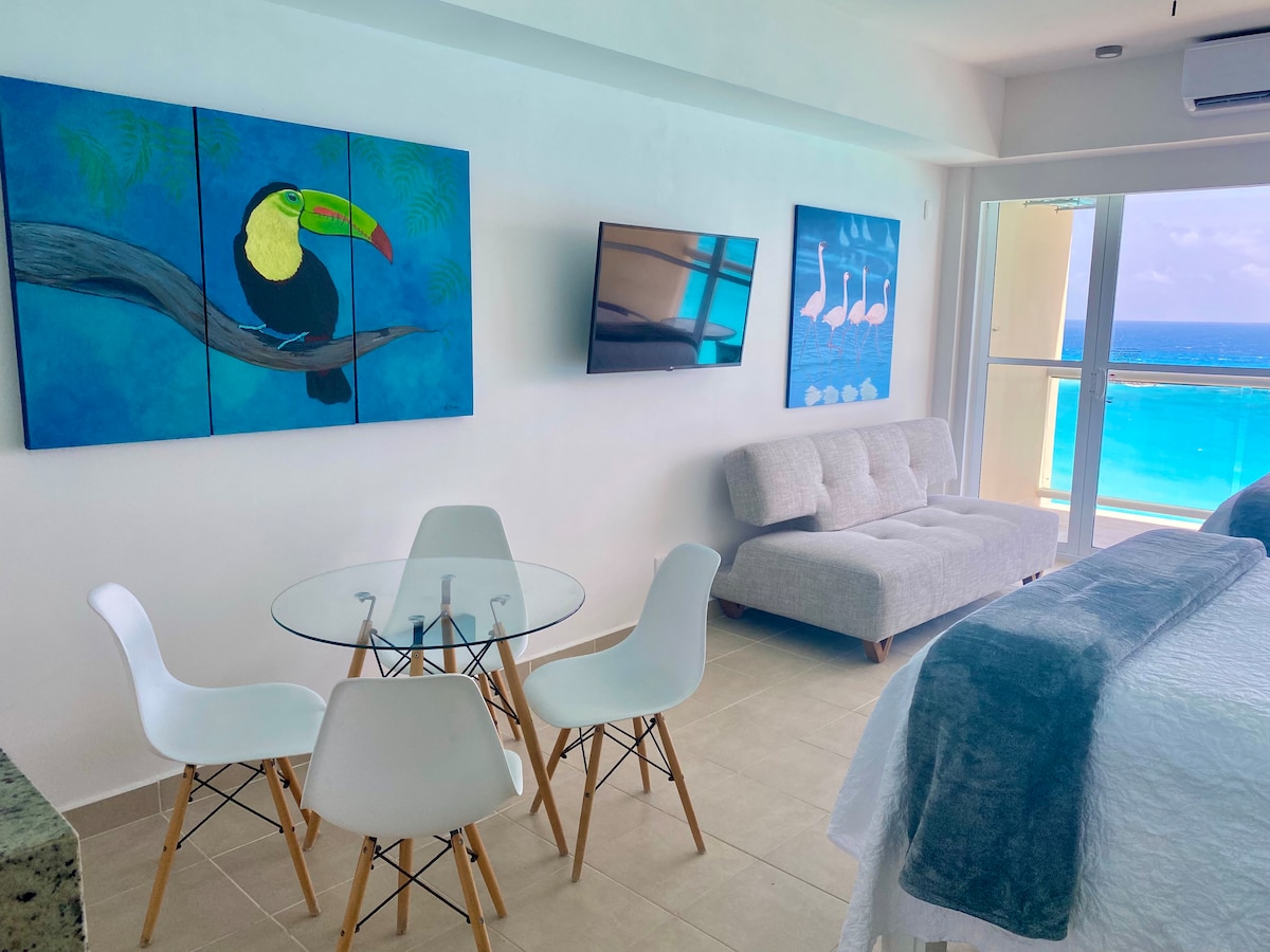 Ongelooflijke studio aan het strand in het hart van Cancun 's Hotel Zone. Heeft een onovertroffen locatie dicht bij restaurants, uitgaansgelegenheden, supermarkten, winkels, autoverhuurbedrijven en alles wat je nodig hebt om van je verblijf te genieten. 24-uursbeveiliging en receptie, gratis toegang tot het strand, zwembad en een kleine fitnessruimte.