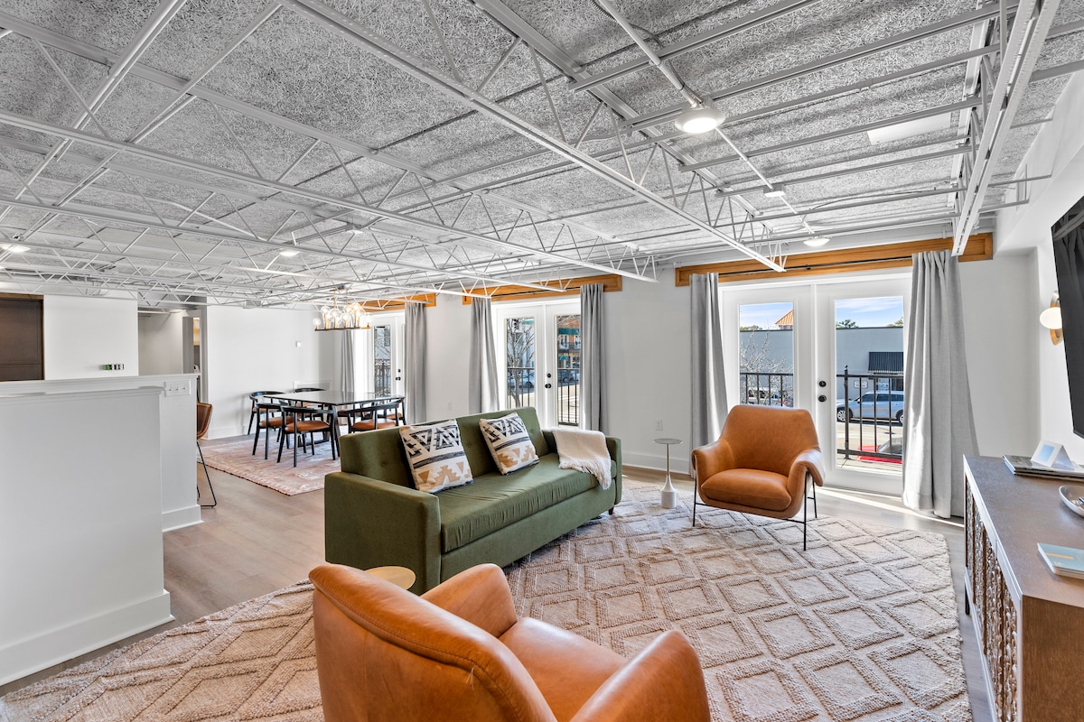 Onze slaapkamer met een loft is 1400 vierkante voet direct tegenover Greers supermarkt, boven Towne & Beech, en op een steenworp afstand van Page & Palette. Er zijn zoveel winkels en restaurants op loopafstand van het appartement en ik vind het heerlijk om op het balkon te zitten en de bezienswaardigheden op te nemen. De hoofdslaapkamer heeft een kingsize bed met een tempur pedic matras, evenals een hoofdbad met bad en aparte douche. De loft heeft een queensize bed met een tempur pedicatras en een tweepersoonsbed.