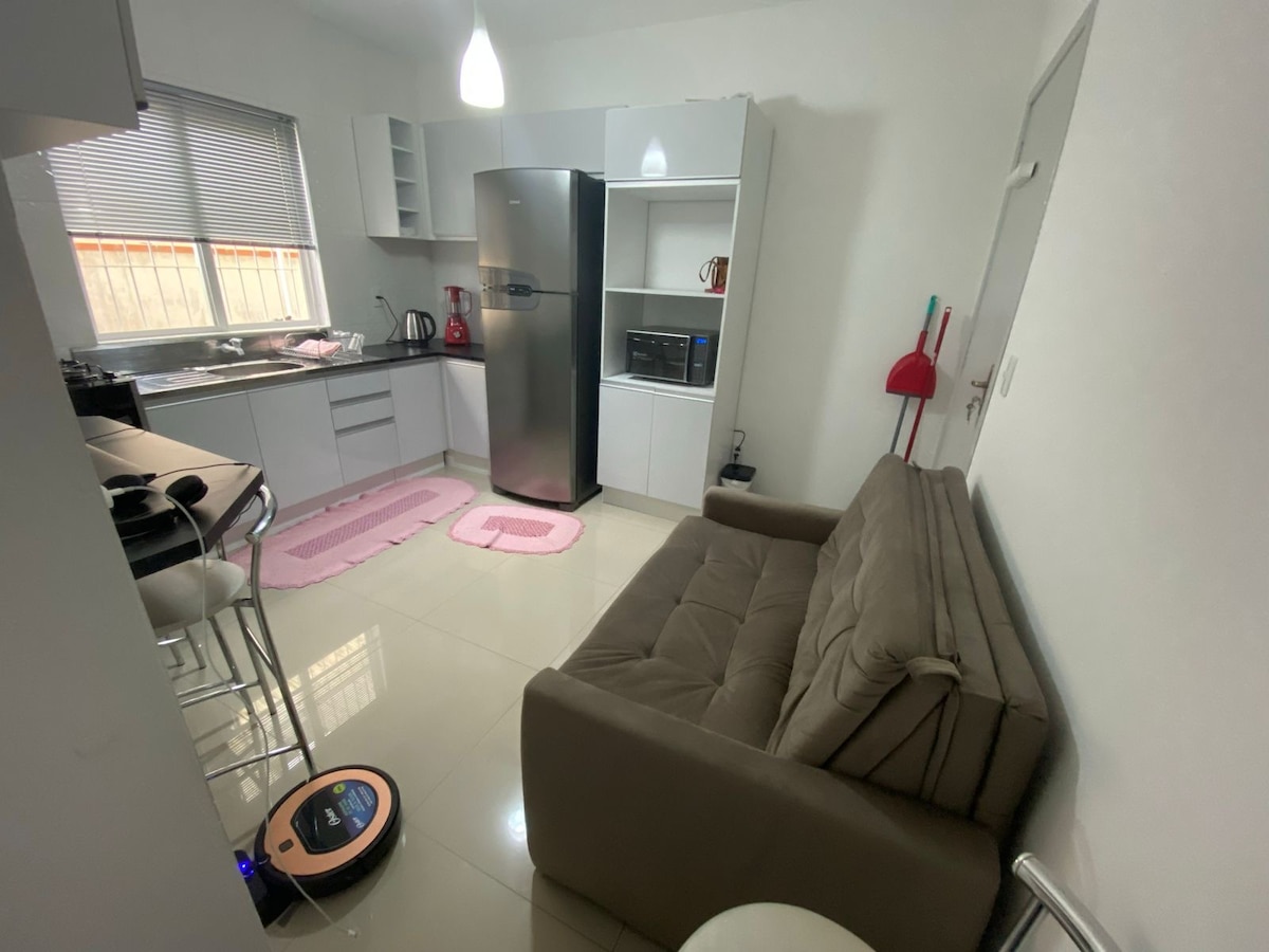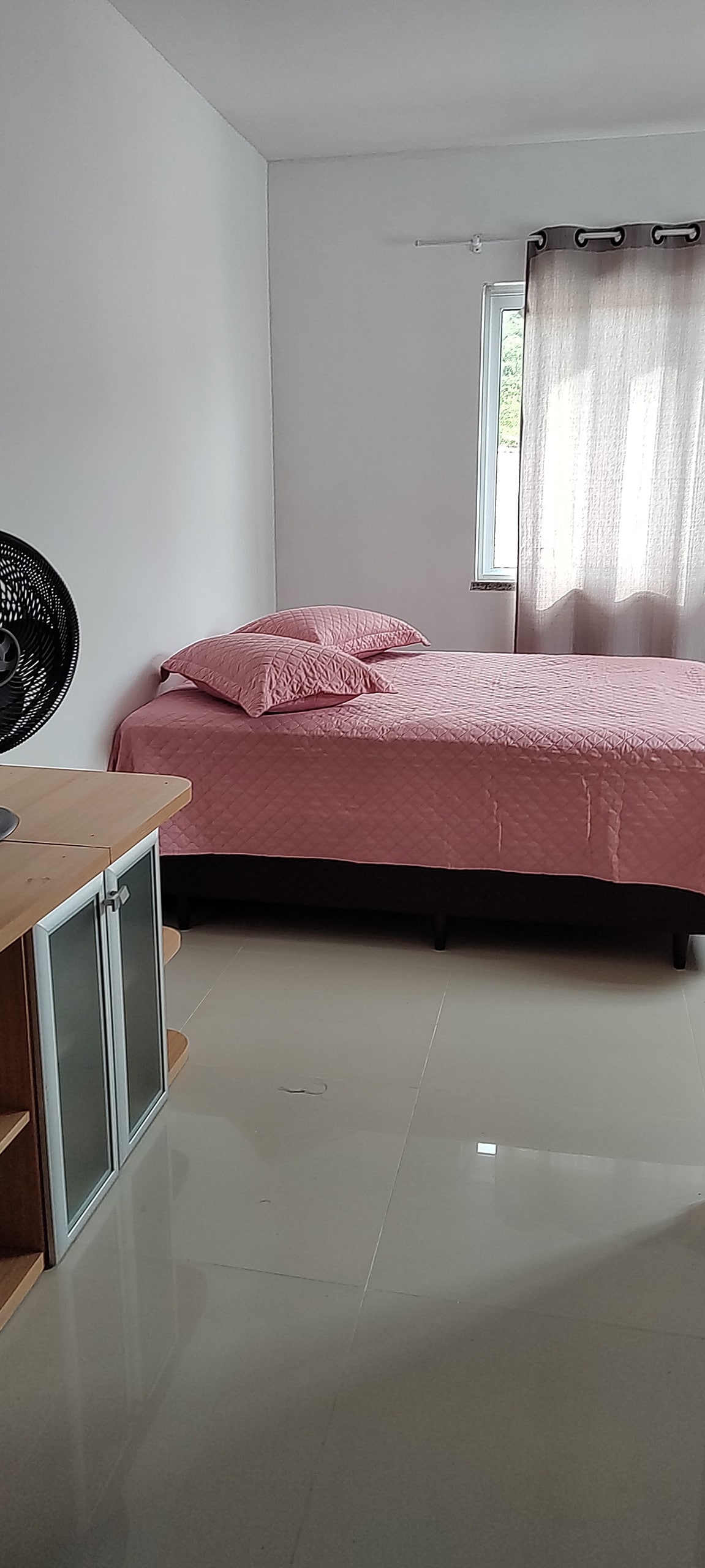 Quer aproveitar as férias ficando em um bairro tranquilo e próximo a praia? Kitnet a 4 minutos de carro e 15 min a pé da praia, supermercados, padarias, restaurantes. Espaço aconchegante para 3 pessoas, sendo um dormitório com cama de casal box queen size e roupeiro, ar condicionado, uma sala equipada com sofá cama e tv com cozinha integrada com geladeira, fogão, forno microondas, possui também lavanderia com máquina. Conta também com área externa equipada com fogão, pia, churrasqueira e lavabo.