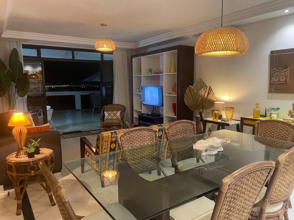 O prédio fica na orla da praia e oferece 4 quartos todos com ar condicionado, sendo 2 suítes, um banheiro social, cozinha toda equipada, sala de jantar, sala de tv , área externa com piscina e churrasqueira particular que compõe banheiro com ducha externa e uma linda vista da piscina para as montanhas. A Cobertura oferece 3 vagas de garagem, Wi-Fi em todos os ambientes.