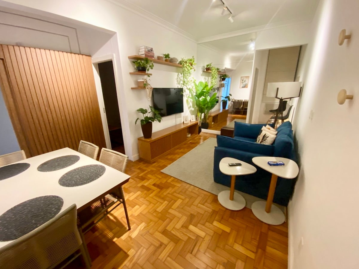 Volledig gerenoveerde, boetiekstijl ontworpen, ingericht en gelegen in een rustige straat in Leme. Afhankelijkheden, groen uitzicht en op slechts 2 blokken van het strand. 2 kabel-tv 's, wifi, Netflix, volledig uitgeruste keuken (koelkast, fornuis, magnetron, wasmachine, koffiezetapparaat, strijkijzer, strijkplank), 2 badkamers, queensize bed e slaapbank, gedeelde airconditioning.