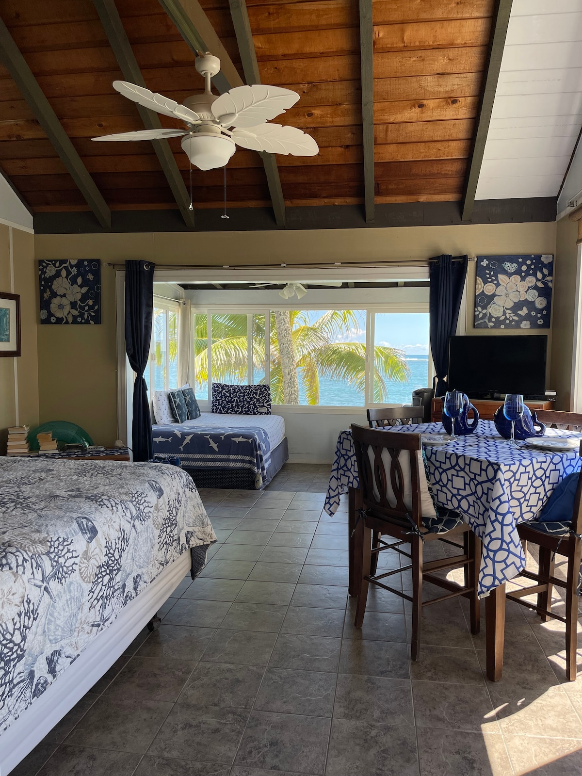 Aan de overkant van het strand, geweldig uitzicht op de oceaan, stranddecoratie, schoon, volledig ingerichte, volledig uitgeruste keuken, eethoek binnen en buiten op het terras met een prachtig uitzicht, stoel bij het raam met uitzicht op de oceaan. AC, Wi-Fi en parkeerplaats voor één auto inbegrepen. Minder dan 10 min rijden naar supermarkten, apotheek, benzinestation, Laie-stad, winkels en restaurants. Minimale reservering van 30 dagen (neem contact op met de verhuurder om je reserveringsdatums te bespreken) GET/TA-152-967-4240-01