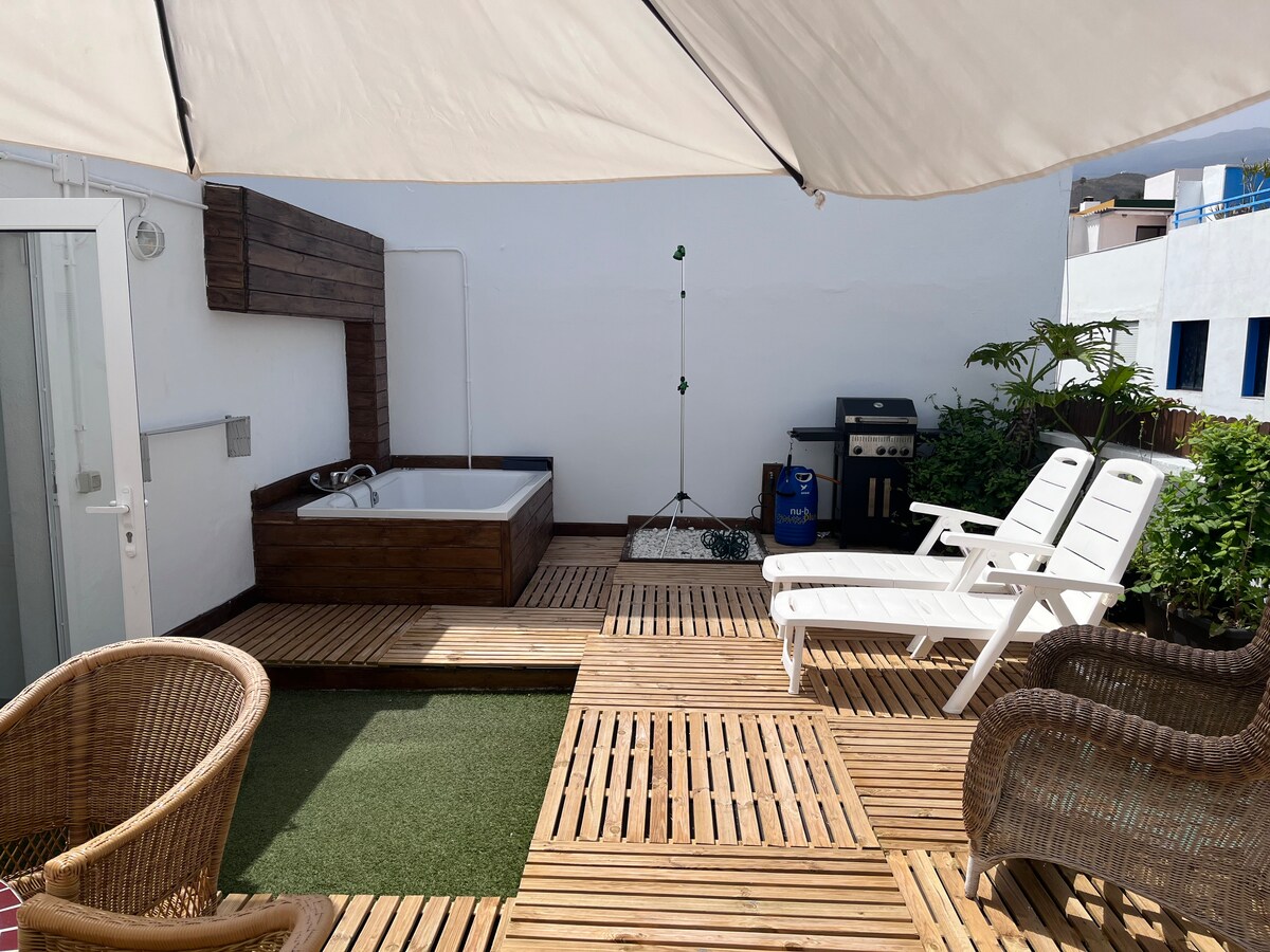 Our lovely, small apartment with terrace (communal) and incredeble views is perfect for 2 quiet, healthy adventurous people. The white and blue fisherman-style apartment on the fifth floor (WITHOUT ELEVATOR), is newly refurbished, near the harbour, old town and beach. There is a free big park place only 5 minutes walk from the apartment, " Parking el Muelle ".