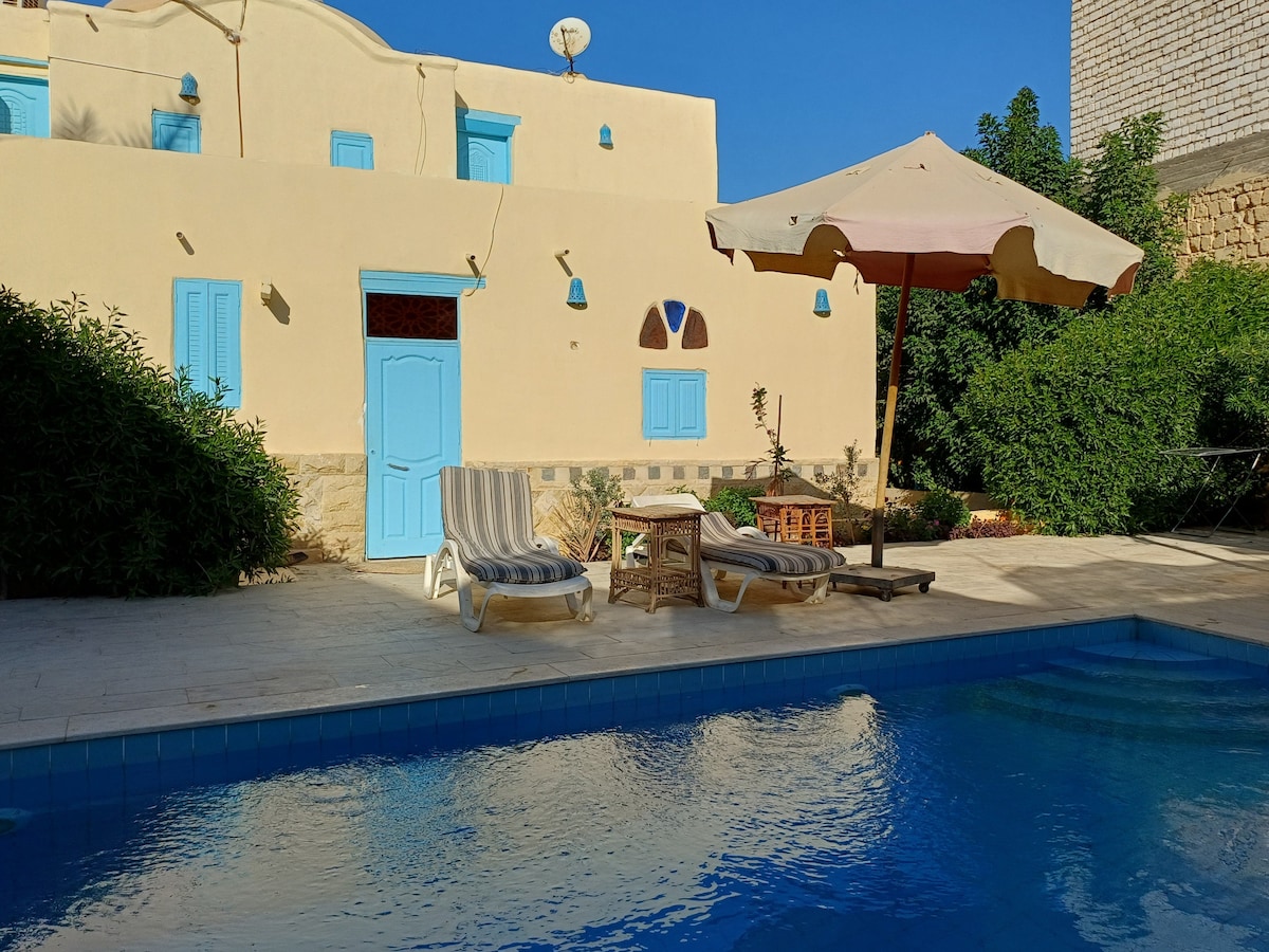 Bienvenue dans ce joli appartement créé par un architecte local (voutes, pierres colorées, mastabas typiques du Fayoum). L’appartement est aussi pourvu d’une belle terrasse privée avec vue sur la campagne environnante, d’une piscine semi-ombragée pour vous protéger du soleil estival, d’un jardin paysager agrémenté d’un barbecue. Vous pourrez profiter de toutes ces commodités de manière exclusive puisque nous louons l’appartement uniquement lorsque nous ne sommes pas au Fayoum.
