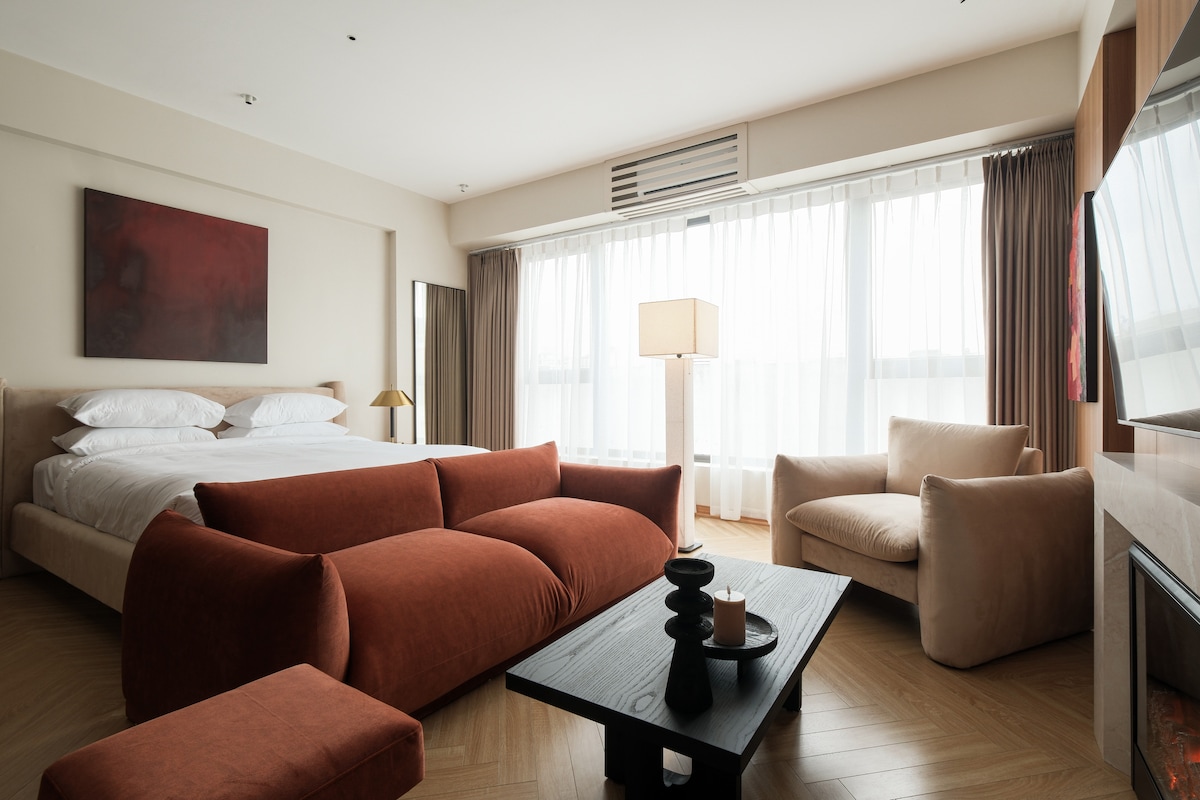 Gerbera The Montclair – Signature Loft with Large Window | Crafted Luxury Living A bright and cozy top-floor apartment featuring a large window that fills the space with natural light. Designed in warm Mid-Century style, it offers a spacious sofa, a soft comfortable bed, a stylish fireplace, and wood-tone furnishings that create an inviting, homely atmosphere — perfect for a relaxing stay in the heart of the city.