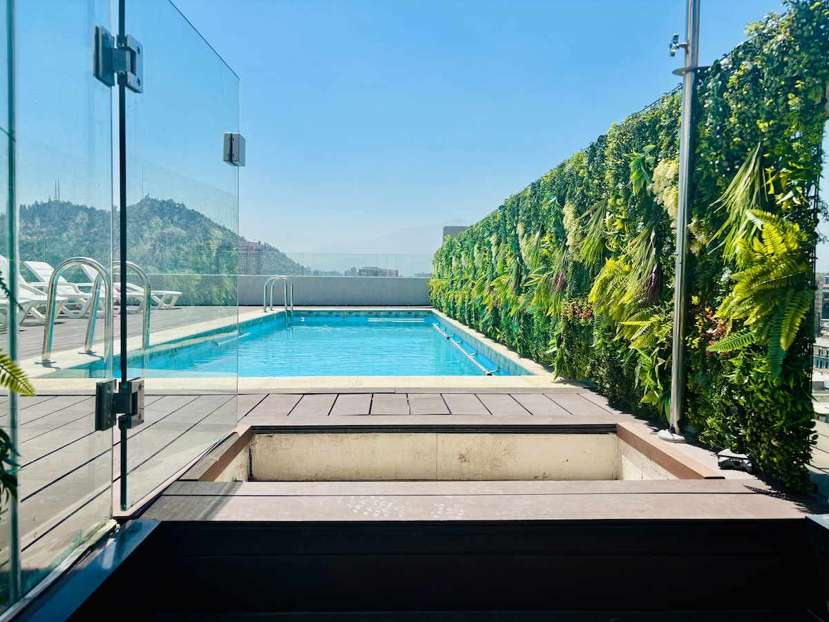 Bienvenidos a nuestro lujoso departamento de dos habitaciones en el corazón de un destino turístico vibrante, con capacidad para cuatro personas y vistas soñadas a la cordillera y al cerro San Cristóbal. No contamos con estacionamiento y de utilizarlo sin autorización, genera una multa por parte del condominio. El departamento es completamente suyo pero los espacios comunes son exclusivos para los residentes como la piscina y quinchos. A pocos pasos del metro, discotecas y bares exclusivos.