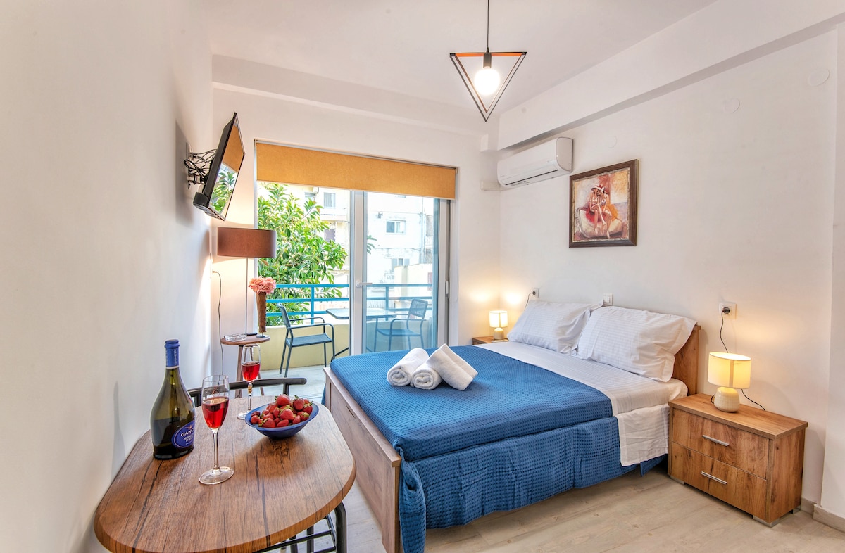 Geniet van je wijn met uitzicht op het Venetiaanse kasteel van Rethymno en het blauw van de zee! Als je zin hebt om te zwemmen, ligt het appartement direct aan het strand! Een modern appartement met één slaapkamer (50 m ²), volledig uitgerust en heeft de mogelijkheid om plaats te bieden aan maximaal vier prs. Het appartement is in een rustige buurt, direct aan het zandstrand (blauwe vlag award). De oude stad ligt op 15minutenlopen op de prachtige promenade van Rethymno. Gratis schaduwrijke parkeerplaats