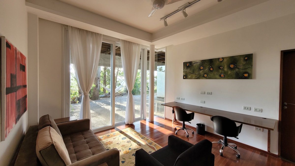 Rustige, goed geventileerde en comfortabele studio, ideaal voor het werken vanuit huis, warme/koude airconditioning, wandelen en in de centrale regio van Floripa, op weg naar de beste stranden. Bureau en stoel, keuken, badkamer. Er zijn andere gedeelde ruimtes, voor yogapraktijken (Casa Aflorar-ruimte), een bevoorrecht uitzicht op Beiramar en de regio, omringd door inheemse vegetatie, tuinen. Glasvezelinternet, airfryer, verduisteringsgordijnen. Bodybuilding in de buurt, fietspaden.