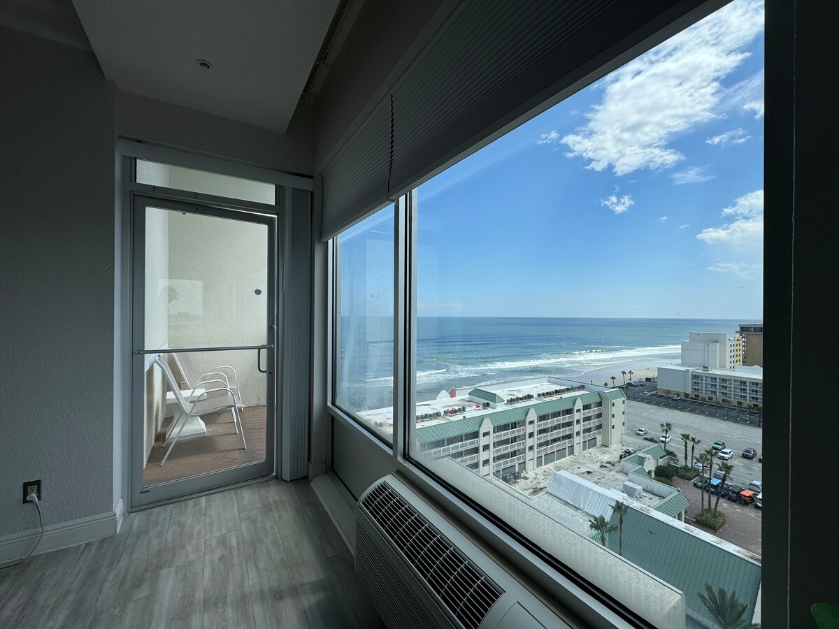 This unique place has a style all its own. A Penthouse corner unit w/ panoramic views, granite counter tops, balcony, kitchenette&an unobstructed view of the ocean,river,&beachside Daytona. Pools are open! The unit is chic and modern.Perfect for a get away. Beach access on side of building. Pool deck damaged but not visible.Parking may be limited near to the hotel,we have additional parking. Looking for good guests to appreciate reduced price while maintaining the unit and having a fun vacation.