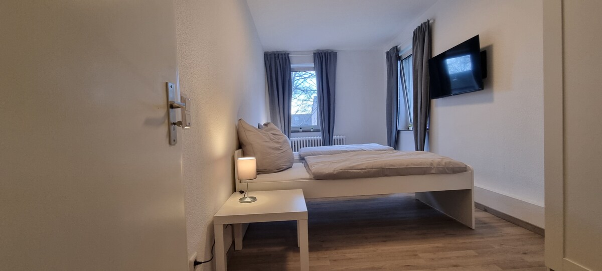 3 1/2 kamer appartement met balkon 1e verdieping, met gratis WiFi op een rustige locatie in de wijk Duisburg-Hochheide - op de grens met Moers. Het heeft een keuken, badkamer, werk, woonkamer en slaapkamer, evenals een opklapbed. Flatscreen satelliet-tv, radio, koelkast, magnetron, koffiezetapparaat, water en eierfornuizen zijn aanwezig. Lakens en handdoeken worden verstrekt. Parkeren is gratis.