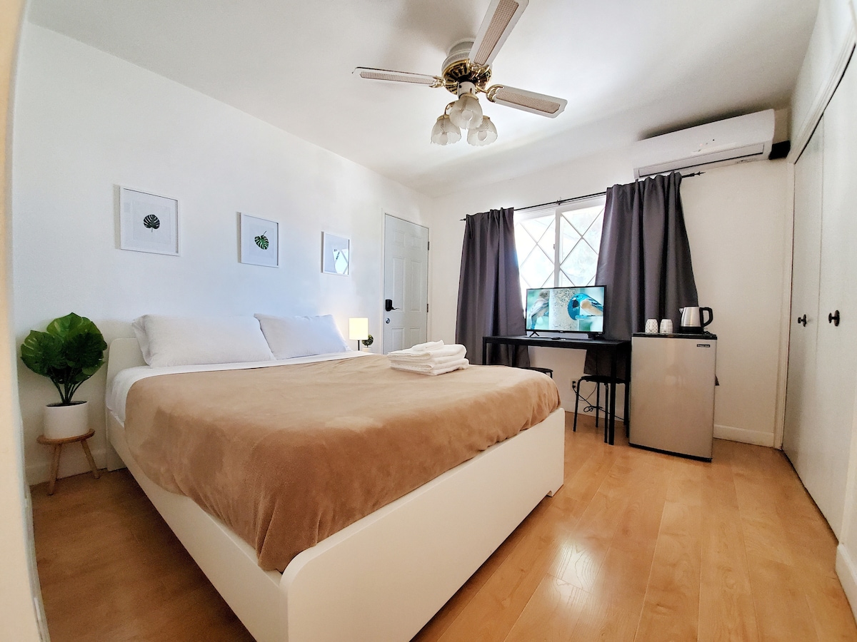 Een volledig nieuwe en gerenoveerde studio met je eigen gemakkelijk toegankelijke parkeerplaats, een eigen ingang, keuken en badkamer. Het beschikt over een queensize bed en een tweepersoonsbed met 2 aparte bedden. Er is een grote bank voor een breedbeeld-Roku-tv met Netflix, een airconditioning-/verwarmingseenheid, een magnetron en een wasruimte. 我次次次中文