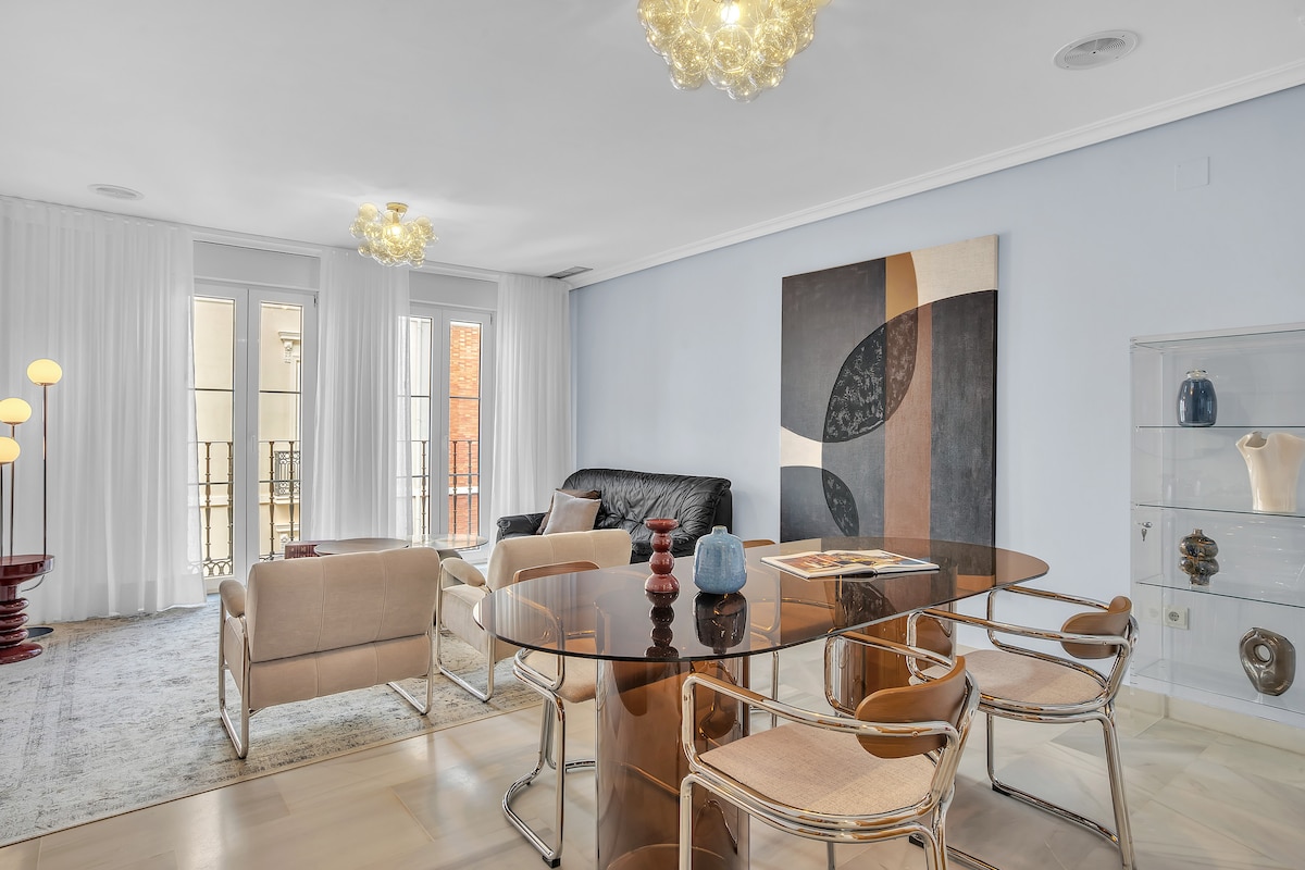 Los Ventanales, a classic 19th century two-bedroom apartment, centrally located in the very vibrant Old Town Malaga. Between Calle Larios and Calle Nueva. Partly renovated, the apartment retains its original Juliet balconies, large windows and high ceilings, creating a bright and sunny space, offering a beautiful view of the San Juan Church. ***NEW*** We recently installed soundproof windows in both bedrooms, to significantly reduce street noise at night.