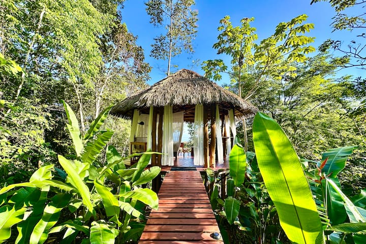 Houten huisje in het bos. Uitzicht op zee en jungle. Ontbijt