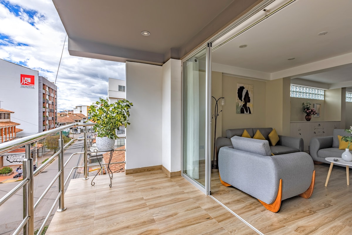 Moderne en comfortabele studio gelegen in een centraal gebied van Cusco, waar je supermarkten, restaurants, restaurants, apotheken, apotheken, apotheken, banken en financiële bedrijven, deviezen, valutahuizen, gezondheidsklinieken en anderen vindt, eenvoudig modern, functioneel, gezellig en goed verlicht. Woonkamer met wifi, Netflix, magische kabel, comfortabele bank, volledig uitgeruste kitchenette, douche met veel 24 uur per dag warm water, terras met parasol en een panoramisch uitzicht op de stad.