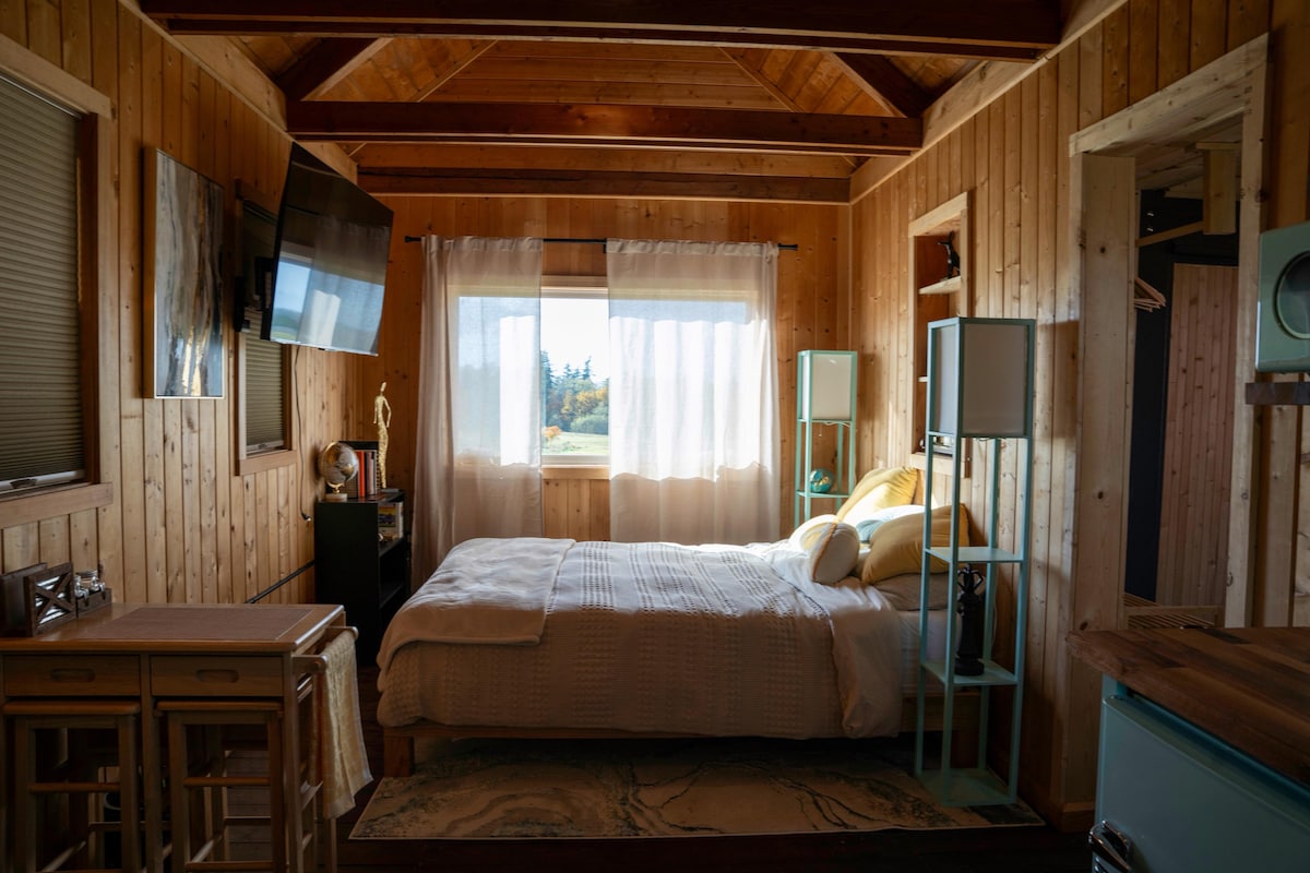 Hidden Pasture Bungalow is gelegen in het platteland van Ferndale; 20 minuten van het hart van Bellingham. Wij zijn gelegen op het terrein omgeven door velden & bomen. Geniet van je eigen studioruimte boven onze aangrenzende garage met een privé-ingang en een privébadkamer. Kitchenette met koelkast en magnetron, broodrooster, koffiepot, koffiepot, elektrische koekenpan en waterkoker; servies en keukengerei. TV met DishNetwork. Wifi beschikbaar. Ga op het balkon zitten en geniet van het uitzicht! Geen huisdieren. Zie de huisregels.