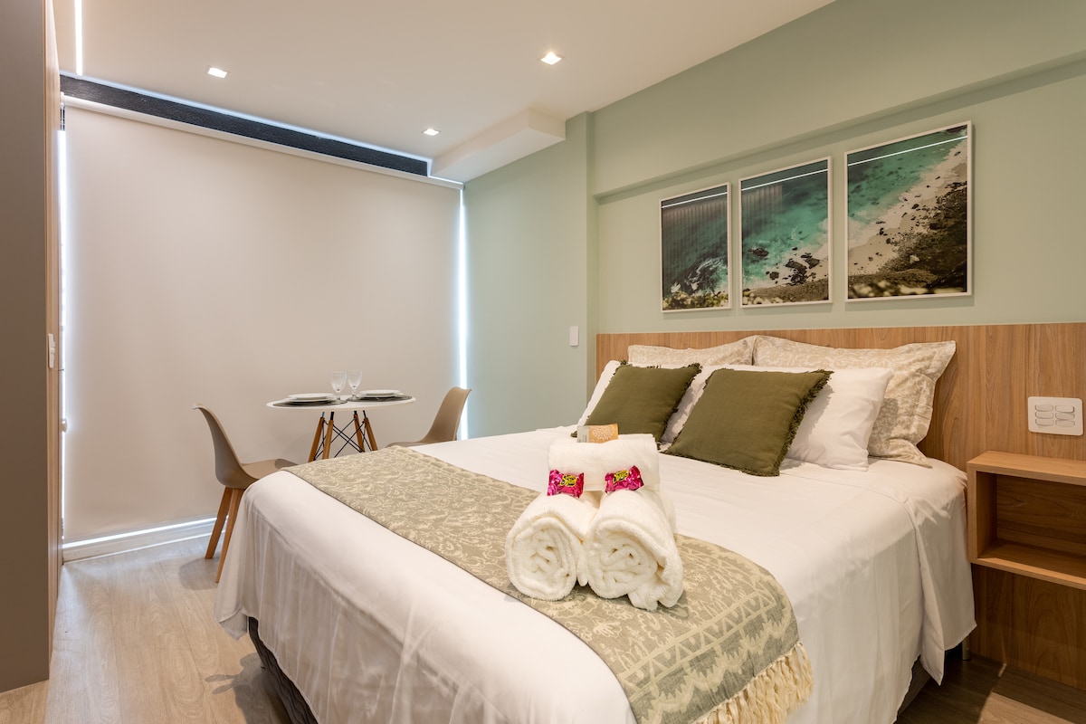 Onze studio van 23 m² is ideaal voor maximaal 2 personen en biedt een queensize bed in een gezellige en functionele omgeving, met een prachtig uitzicht. Het appartement heeft een complete recreatiezone (zwembad op het dak, speelkamer en sauna, toegestaan voor verblijven langer dan 3 maanden), een supermarkt op de begane grond en een 24-uurs conciërge. Het appartement ligt op slechts een steenworp afstand van het metrostation Adolfo Pinheiro (lijn 5 - Lilac) en dicht bij de universiteit van Santo Amaro, wat mobiliteit en functionaliteit biedt voor je reis.