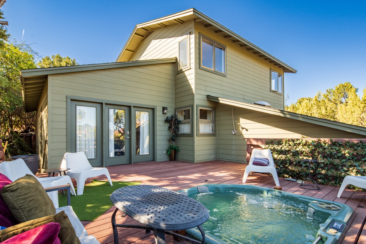 10/10 PERFECTE LOCATIE met uitzicht uit bijna elk raam! Prachtig historisch huis in het hart van Sedona. 3 slaapkamers met gedeelde plattegrond - de 3e slaapkamer heeft een queensize bed met een ander bed/uittrekbed in de lof. 2000 SF op 1/3 acre met een hot tub, loopafstand van restaurants, winkels en gelegen direct naast het geweldige Tlaquepaque (5 minuten lopen) en de kreek! Midden in alles, maar toch heel privé. Op loopafstand van Brewer Hiking Trail. Gratis Tesla-oplader. Beste Airbnb in Sedona door de AZ Insider.