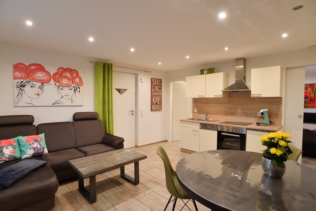 Het in 2019 gebouwde appartement van 538 vierkante meter bevindt zich bovenop de garage van het huis van onze architect in een rustige woonwijk op 11 km afstand van Europapark. Het heeft een aparte ingang en bestaat uit een ruime kamer met boxspring tweepersoonsbed (2m x 2m), bank en eethoek met vrij uitzicht op de natuur (biotoop). Er is ook een aparte, volledig uitgeruste keuken en een badkamer met inloopdouche. Wifi en tv beschikbaar. Verder is er een aparte parkeerplaats.