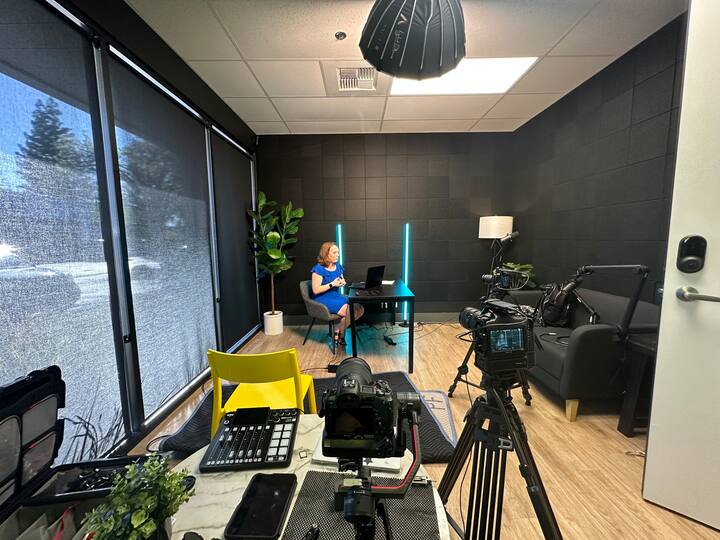 Deze opstelling voor interviews met meerdere camera's omvat verlichting en audio en 4K-beelden, met mogelijk fotografie en bewerking.
